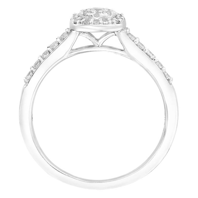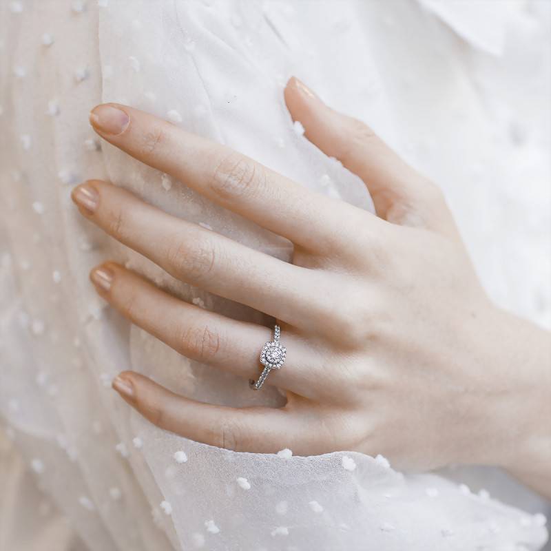 Cette élégante bague de fiançailles est réalisée en or blanc palladié 750/1000 (18K) avec des diamants symbole de l'harmonie et de l'éternité. Il propose une forme carrée composé de trente-cinq diamants sertis à grains disposés sur toute la tête de bague et sur le demi-tour de l'anneau pour un poids total de 0,32 carat. Le poids d'or moyen est quant à lui de 3,27 grammes.