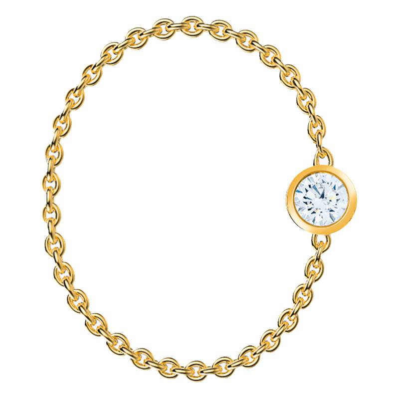 Le modèle que vous voyez ici présente une bague en or jaune 750/1000 (18K) composée d'un diamant de qualité GVS1 qui est serti clos dans de l'or. Pour une touche d'originalité, le diamant est accompagné d'une chaîne maille forçat de la même qualité d'or. Un ensemble raffiné et intemporel qui sera porté sans aucune difficulté, soyez-en certain ! Selon votre souhait, le diamant central vous est proposé en version 0,05 carat ou 0,09 carat. La mannequin porte la version avec le diamant de 0,09 ct. Enfin, le poids d'or moyen de cette bague est de 0,50 gramme pour la taille 49.