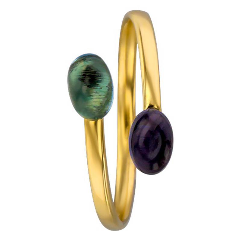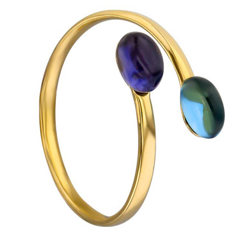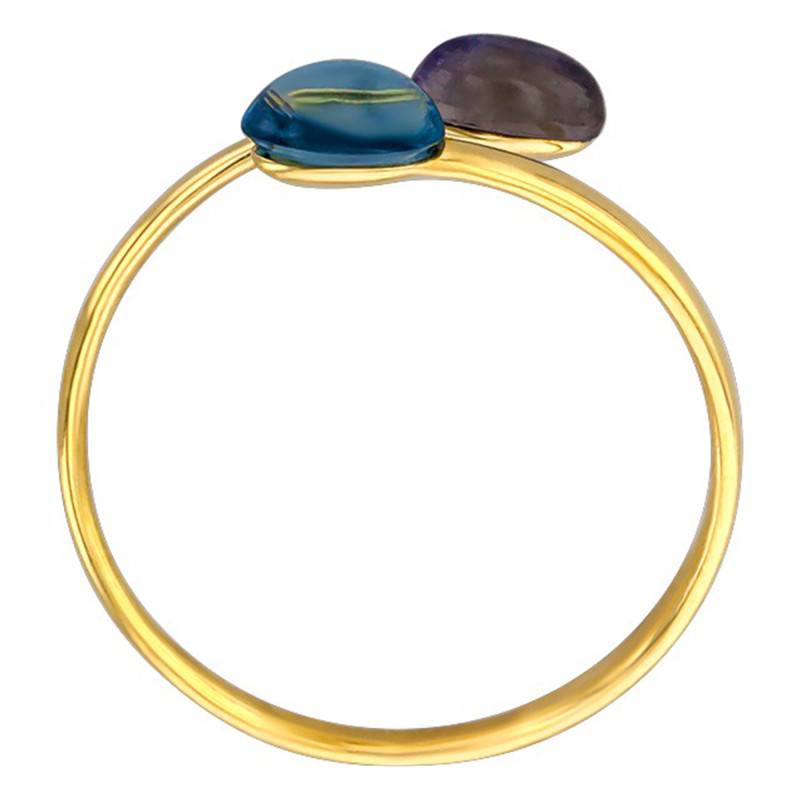 Découvrez cette élégante bague en or jaune 750/1000 (18K) surmontée d'une topaze et d'une améthyste ovales taillées en cabochon. Les topazes sont des gemmes naturelles, pour améliorer leur couleur, un traitement de chauffage est appliqué, un traitement accepté par la confédération internationale de la bijouterie-joaillerie.