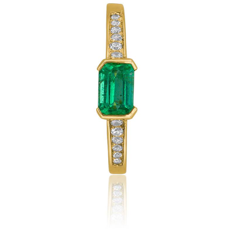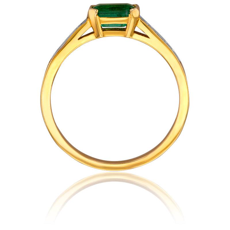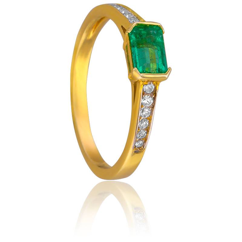Ce bijou est composé d'une émeraude rectangulaire de 6 x 4 mm de 0,35 ct environ, sertie quatre griffes. Six diamants sertis à grains sont placés de chaque côté de la pierre.