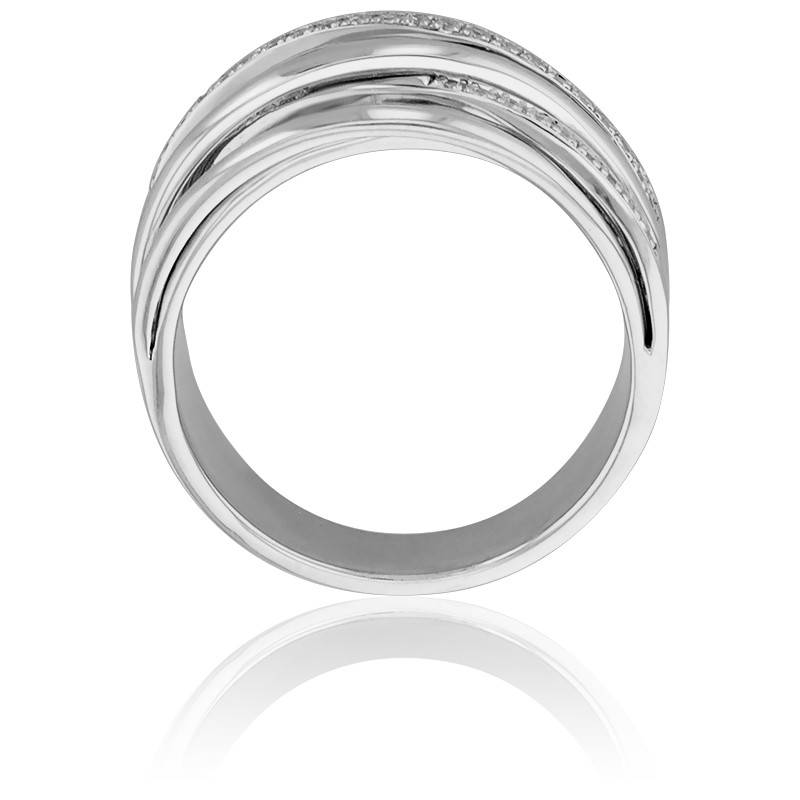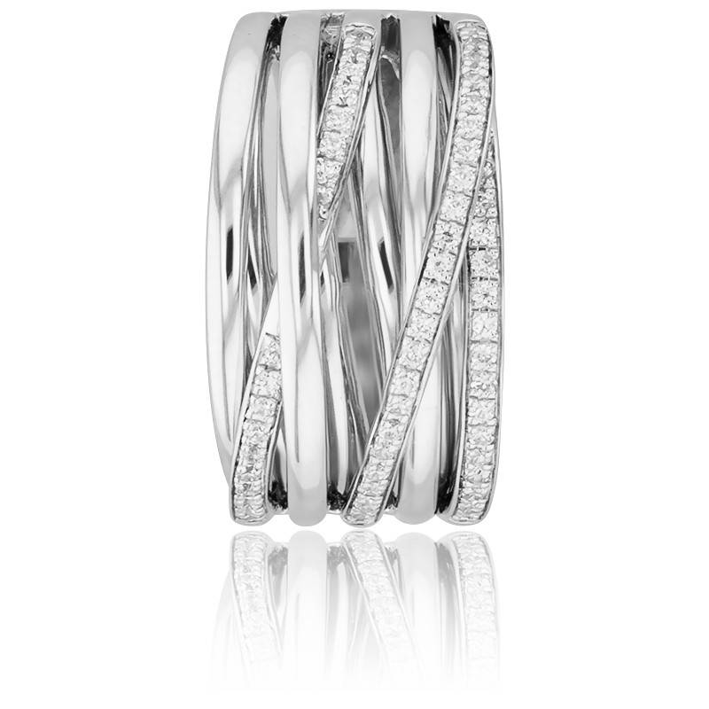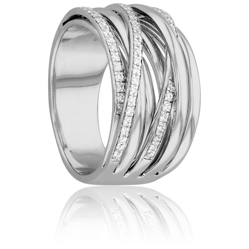 Ocarat vous présente cette bague or blanc et diamant rhodié 750/1000 (18K) composée de dix bandes dont cinq intérieures et cinq extérieures qui s'entrecroisent et laissent apparaitre trois d'entre elles pavées de diamants sertis à grains. Cette va apporter une grande touche d'originalité à votre look.