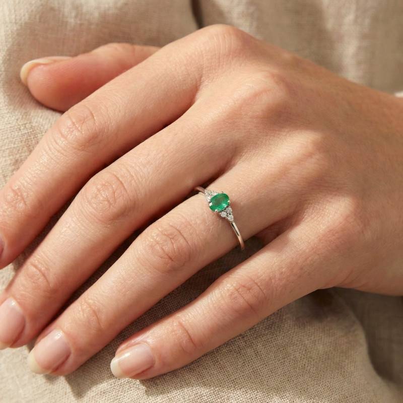 Cette bague d'exception est taillée pour orner votre doigt à la perfection. Fabriquée en or blanc 375/1000 (9K), elle prend la forme d'un anneau poli qui présente une teinte argentée. Celui-ci, affichant une largeur de 2 mm, porte sur son plateau des gemmes renforçant son charme. Il s'agit de diamants brillants GH-P2 de 0,05 ct et d'une émeraude verte disposant d'une largeur de 5 mm sur une hauteur de 6 mm, d'environ 0,53 ct. Ces merveilleuses pierres confèrent à la bague une élégance intemporelle. Par ailleurs, ce ravissant bijou est réalisé avec un poids d'or moyen de 1,50 gramme.