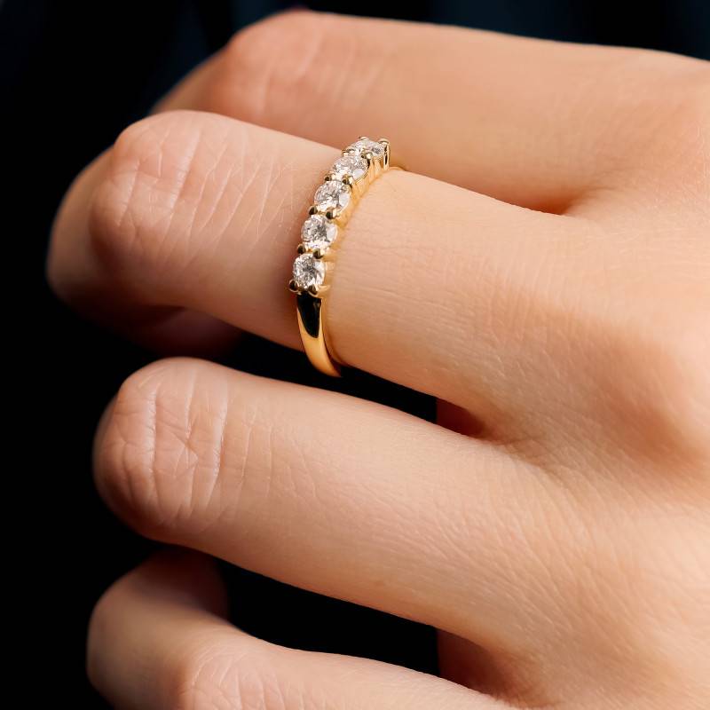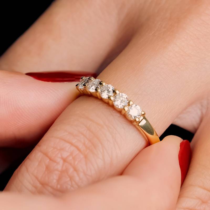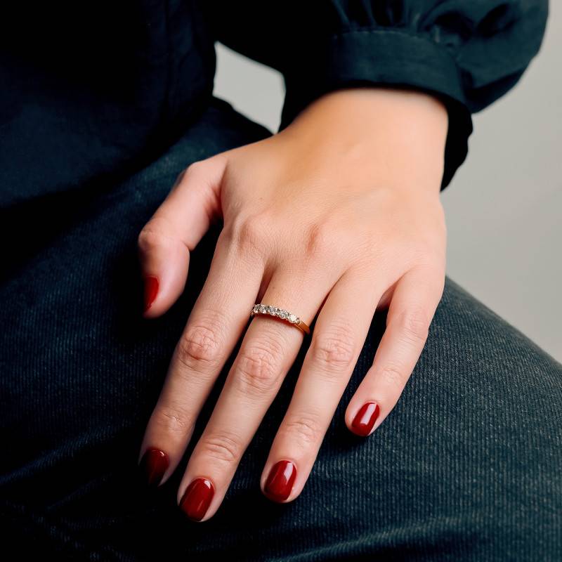 Sublimez votre éclat avec cette bague en argent 925 plaqué or. Arborant 5 diamants de synthèse cultivés en laboratoire d'une pureté éblouissante totalisant 0,50 ct, chaque pierre d'un blanc éclatant, finement sertie en serti à griffes. Ce bijou de 1,70 g se pare d'une finiton polie et brillante pour donner de l'éclat.