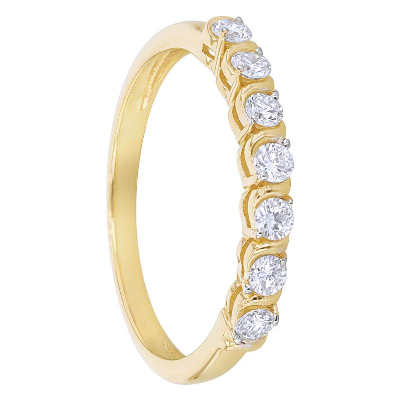 Cette bague pour femme, resplendissante dans son éclat jaune, est un bijou de délicatesse. Façonnée en argent et sublimée par un plaquage en or, elle présente une finition polie et brillante qui capte la lumière à chaque mouvement. Sertie de diamants de synthèse cultivés en laboratoire, blancs, pesant au total 0,31 ct, chaque pierre est montée en serti à griffes, formant un ruban étincelant sur votre main. D'un poids léger de 1,50 g, cette bague est à la fois une promesse de douceur et de robustesse.