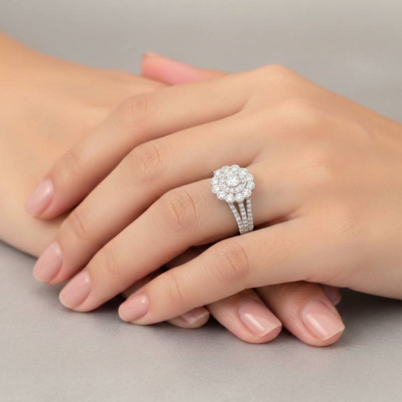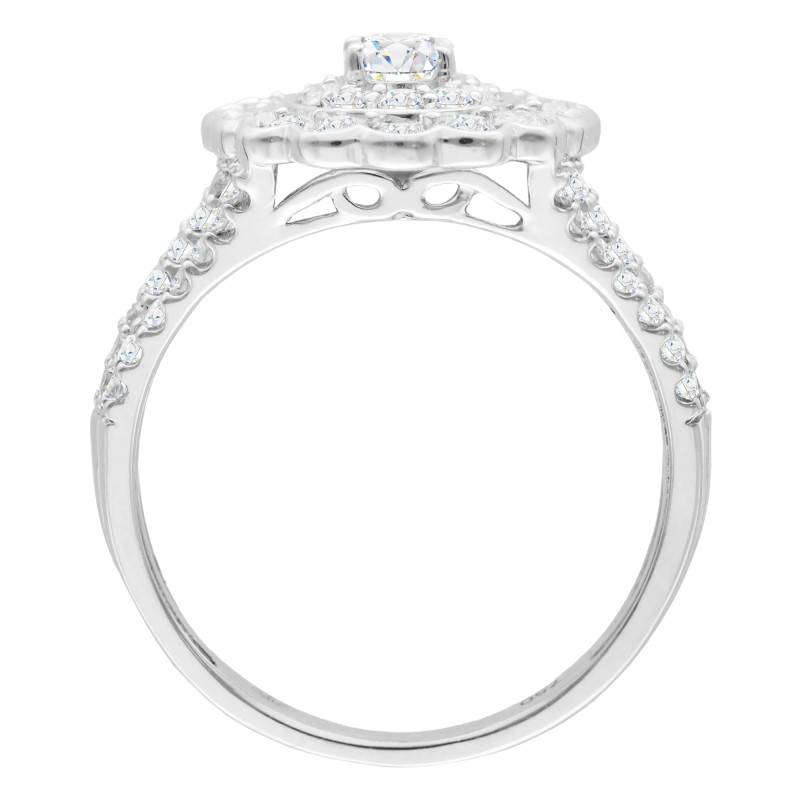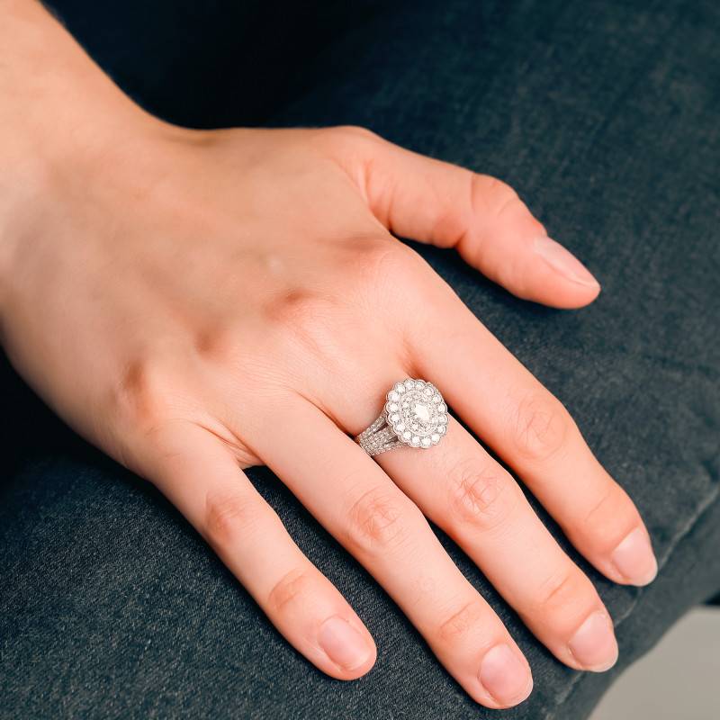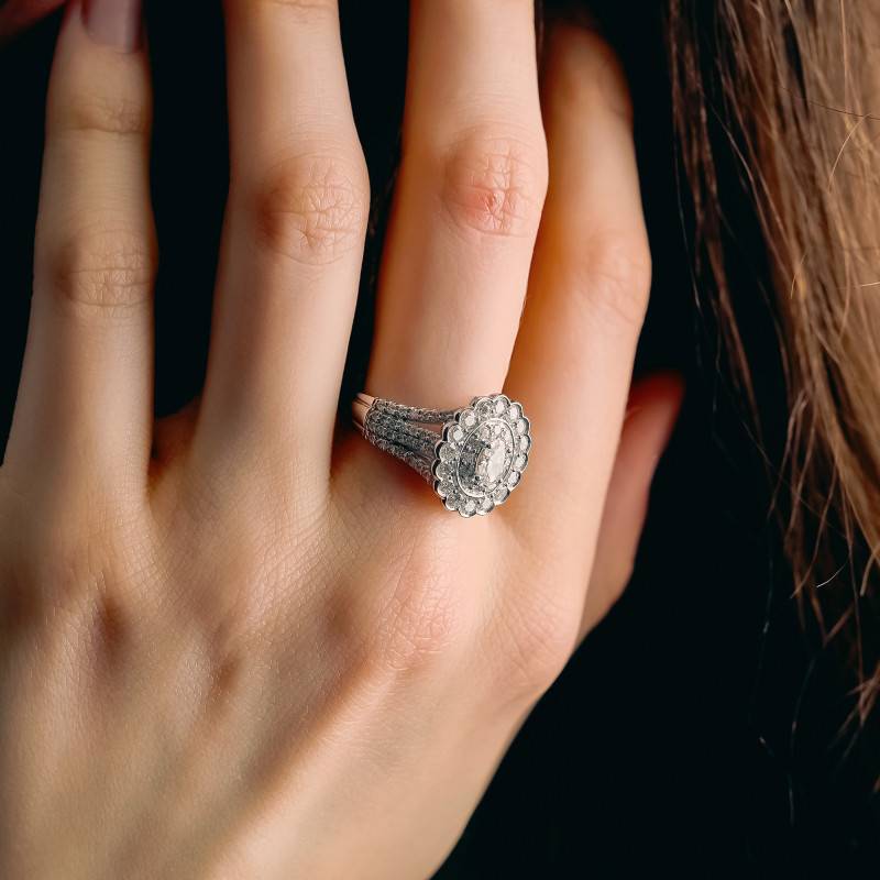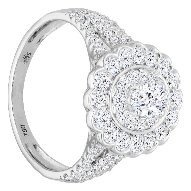 Laissez-vous séduire par cette sublime bague réalisée en or blanc 750/1000 (18K) palladié. Son anneau de 1,38 mm d'épaisseur et de 5,65 mm de largeur est orné de sublimes diamants qui scintillent de mille feux. Pour plus d'élégance, il arbore un plateau au design floral. Ce dernier mesure 15,35 mm de largeur et 5,60 mm d'épaisseur. Les diamants HSI2 qui l'ornent déploient une brillance inégalée. De plus, ces pierres précieuses totalisent 1,46 ct et font de cette bague, un bijou prestigieux à porter sans aucune modération ! Notez que son poids d'or moyen est de 5,42 grammes.