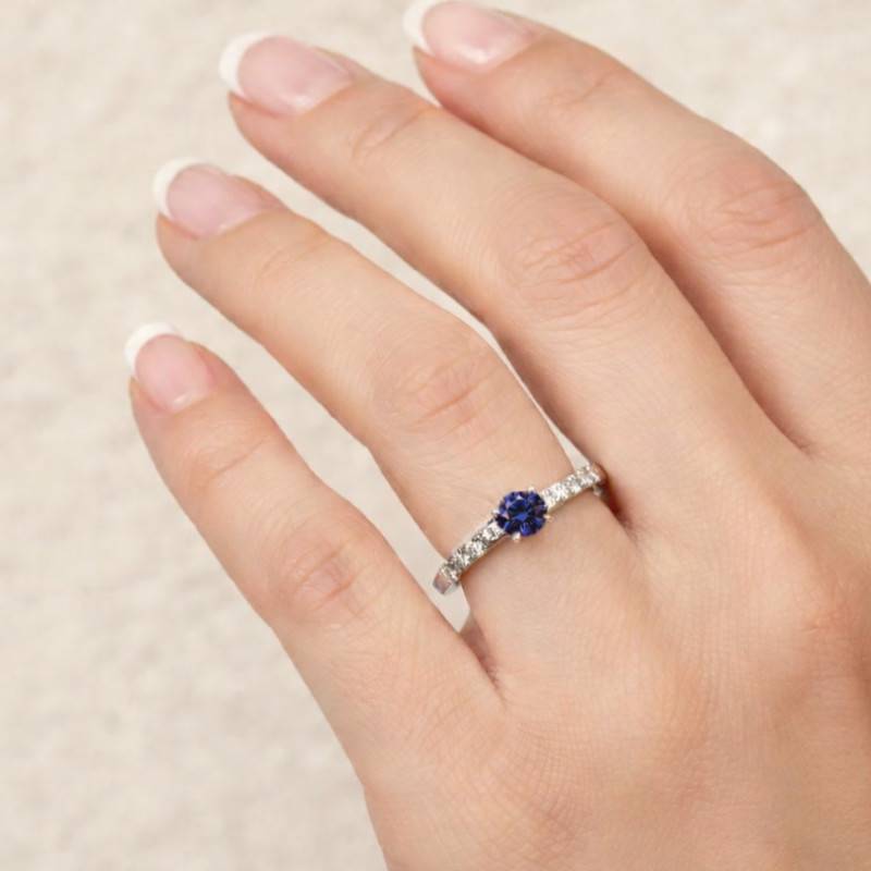 Optez pour cette bague en or blanc 750/1000 (18K), embellie par une finition polie pour un rendu brillant accrocheur une fois portée. Son anneau épuré et fin vous assurera un port agréable et un confort absolu au quotidien. Il est agrémenté au centre par un délicat saphir de 0,66 ct environ, de forme ronde et de couleur bleue. Scintillant de mille feux, ce dernier est serti à quatre griffes et mesure 5 mm de diamètre. Il est accompagné par six diamants brillants et blancs de 0,06 carat qui sont répartis sur les deux côtés. Ces pierres étincelantes accordent au bijou une note de subtilité raffinée et viendront vous faire resplendir en toute occasion. À porter seule ou accompagnée, cette bague est le choix parfait pour rehausser votre style. Elle vous est proposée en deux tours de doigt : 52 et 54.