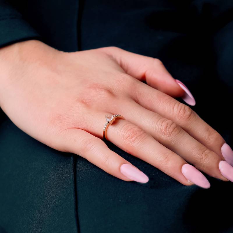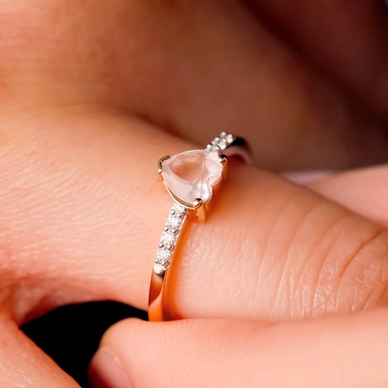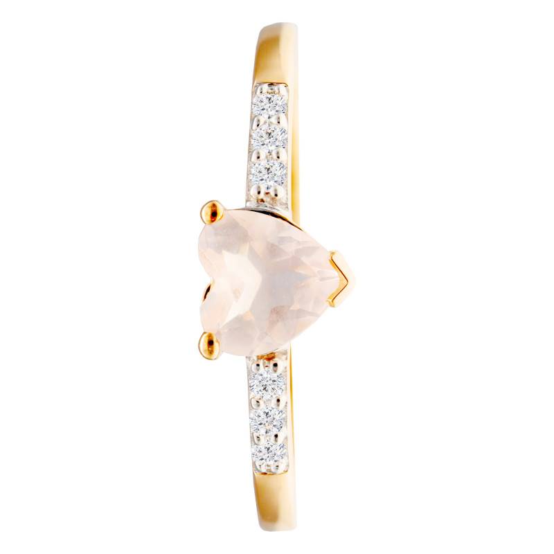 Parfait mariage entre force et délicatesse, cette somptueuse bague vous éblouira par sa beauté onirique. Savamment travaillée, sa monture en or rose 375/1000 (9K) de 1,73 gramme porte une prestigieuse pierre en forme de coeur en quartz rose de 0,66 ct et révèle un éventail de reflets étincelants. Elle mesure 5 mm de largeur, 5 mm de hauteur et 4 mm d'épaisseur. Ses 6 diamants de 0,05 ct disposés de part et d'autre capturent la lumière pour faire briller le bijou de mille feux. C'est une pièce unique qui, en toute légèreté et douceur, sera le témoin romantique et charmant de vos instants heureux. Elle se décline en plusieurs diamètres afin de s'ajuster parfaitement à votre tour de doigt, en allant de la taille 48 à 60.