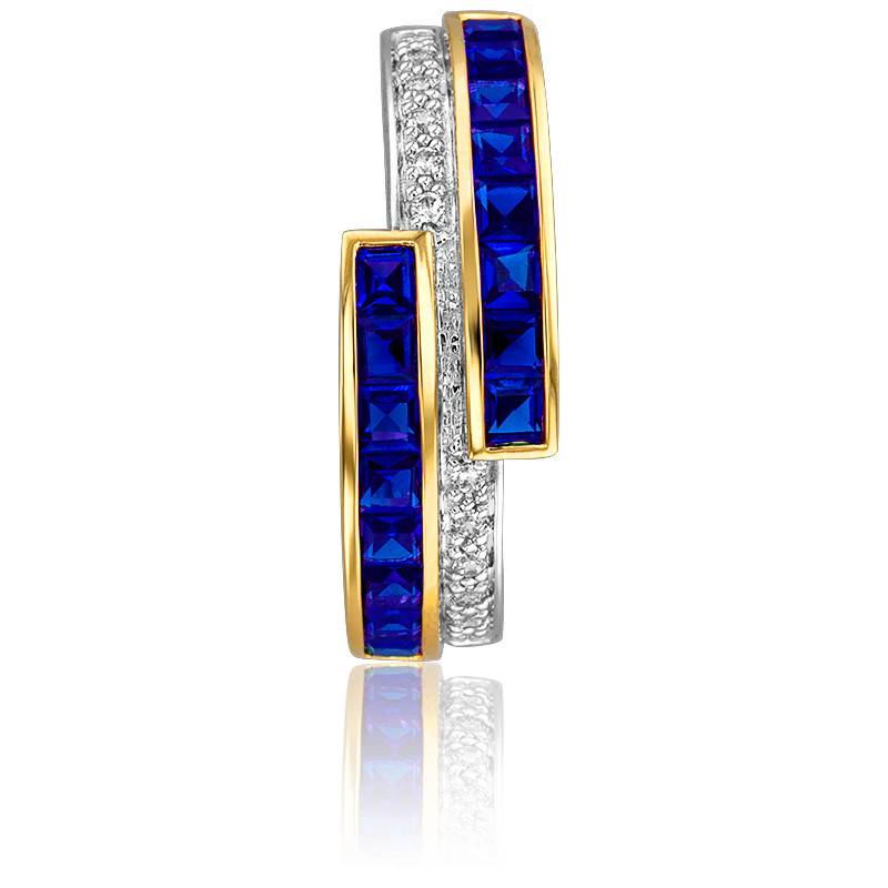 Craquez pour cette bague très tendance composée de trois fils d'or qui se chevauchent et s'alternent. Le fil central est en or blanc 750/1000 (18K) pavé de diamants taille brillant et sertis grains tandis que les deux autres fils sont en or jaune 750/1000 (18K) pavés de saphirs en coupe princesse et sertis rails. Chaque fil d'or est large de 2,50 mm.