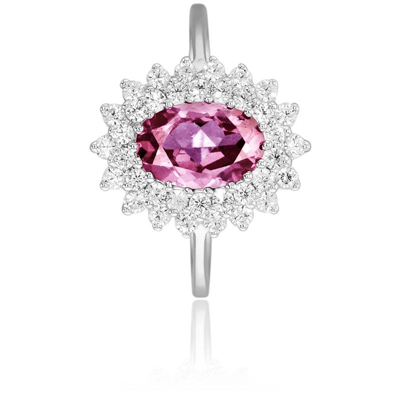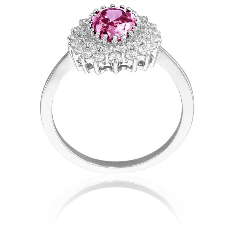 Cette superbe bague en or blanc 750/1000 (18K) à la finition polie est une pièce de joaillerie très rare. La tête de bague de 15 x 13 mm est composée d'un saphir rose de 6 x 8 mm, d'un poids de 1,75 carat. Celle-ci surplombe un pavage de diamants éblouissant. La première rangée est composée de dix-huit diamants sertis à griffes pour un poids total de 0,25 carat. les dix-huit autres diamants ont un poids total de 0,29 carat. Les diamants sont de couleur H et de pureté SI1. L'anneau de la bague fait 2 mm de largeur et 6 mm d'épaisseur.
