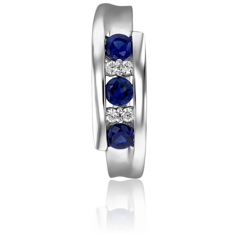 Tombez sous le charme de cette bague élégante et discrète en or blanc 750/1000 (18K) qui fait alterner trois saphirs bleus taille brillant et sertis semi-clos et quatre diamants taille brillant sertis semi-clos.