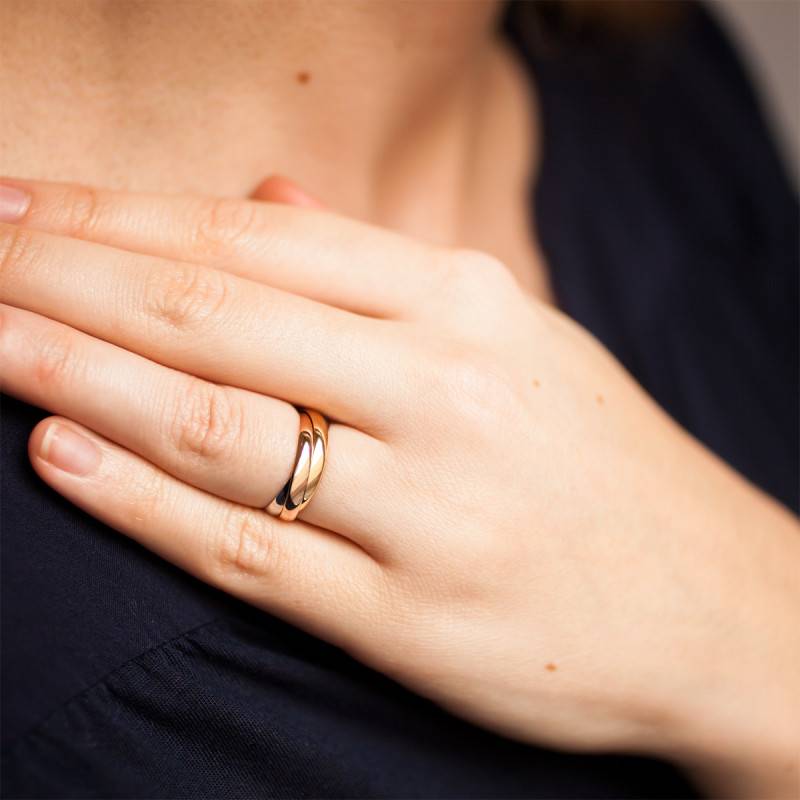 Cette bague 3 ors a été dessiné en 1924 par Jean Cocteau pour son ami Raymond Radiguet. D'abord symbole des homosexuels et portée au petit doigt, elle est devenue au fil du temps une bague classique de la joaillerie parisienne. Cette alliance a été réalisée en or jaune, or blanc palladié et or rose 750/1000 (18K). Les 3 ors symbolisent l'amour, l'amitié et la fidélité. L'anneau a une largeur de 2,50 mm pour une épaisseur de 0,90 mm. Cette bague conviendra également comme alliance. Comptez un poids d'or moyen de 3,35 grammes.