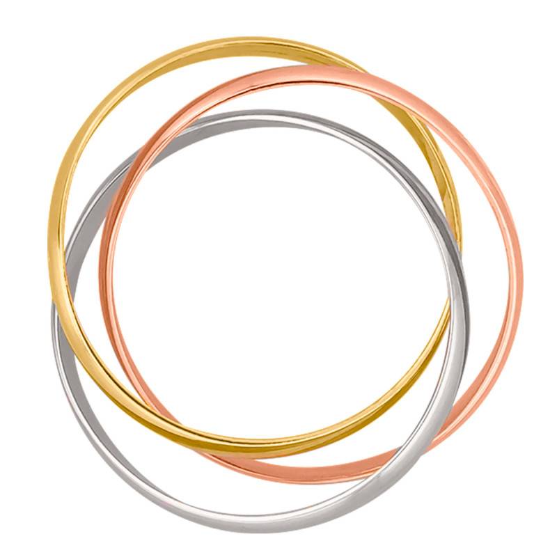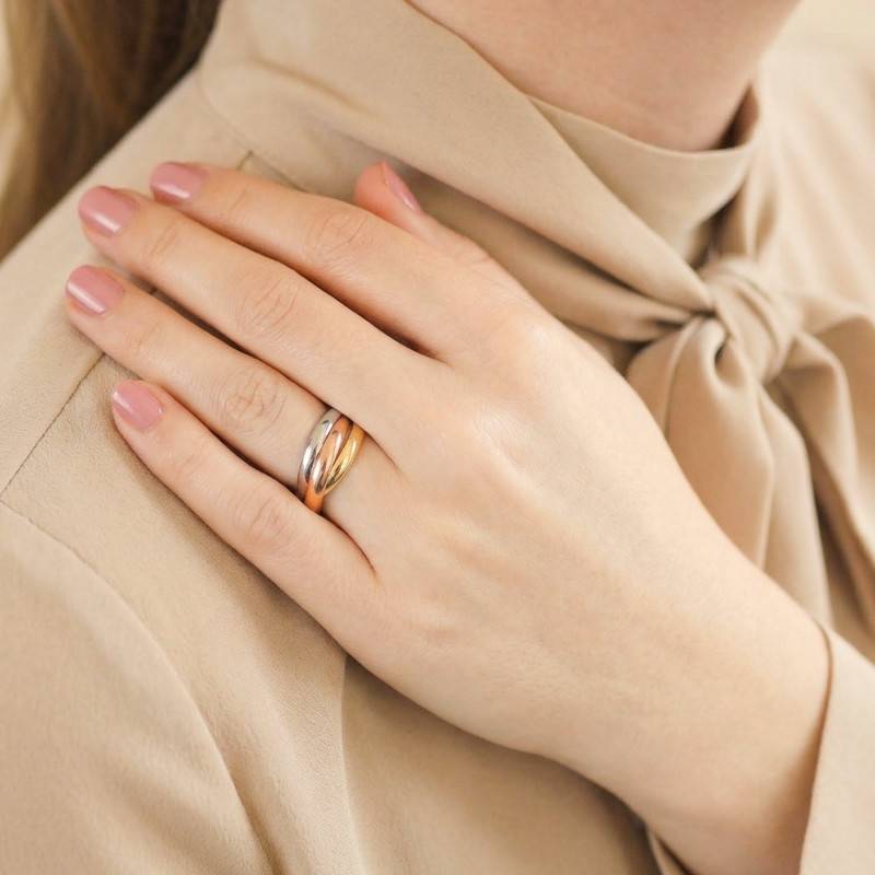 La maison Amore vous présente cette ravissante bague 3 ors composée de 3 anneaux de 4 mm de large. Les trois anneaux sont respectivement en or jaune, or blanc et or rose 750/1000 (18K). Il s'agit de demi-joncs donc des anneaux bombés sur le dessus et dont l'intérieur est plat et lisse sur votre doigt.