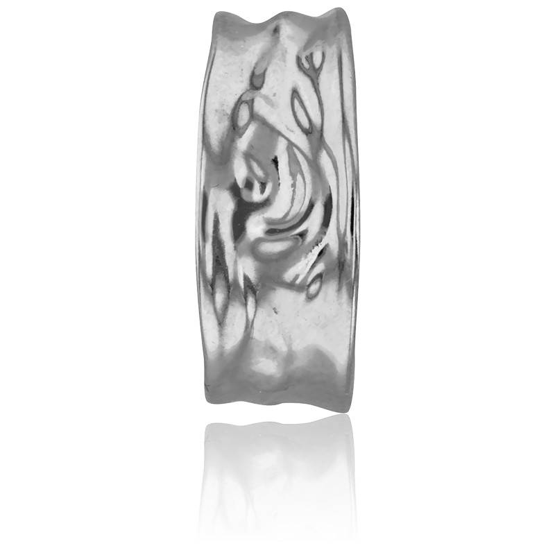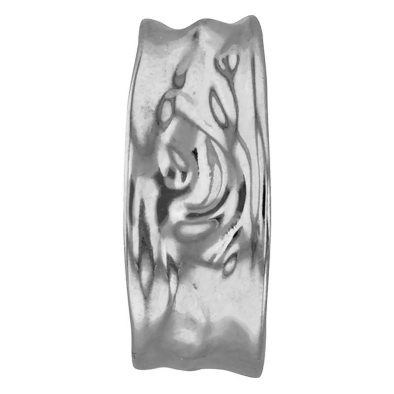 Nous sommes heureux de vous proposer cette création qui va vous plaire à coup sûr ! Cette bague très fashion est réalisée entièrement en or blanc 375/1000 (9K) dont l'anneau a été travaillé afin qu'un effet froissé soit révélé. L'anneau a une largeur de 7 mm pour une épaisseur de 0,50 mm. Comptez un poids d'or moyen de 1,25 gramme pour cette bague.