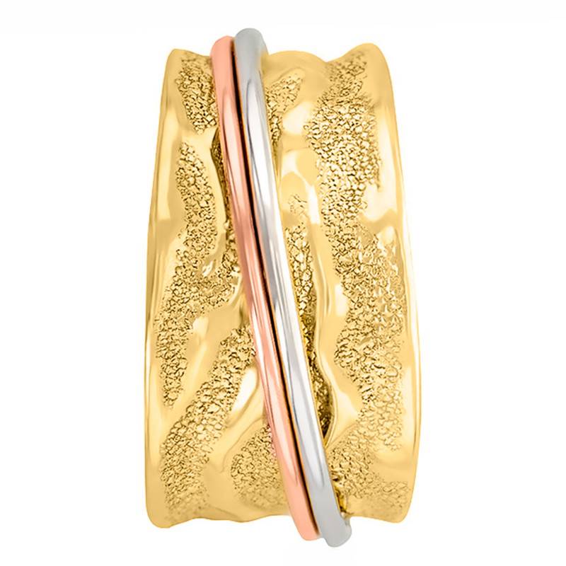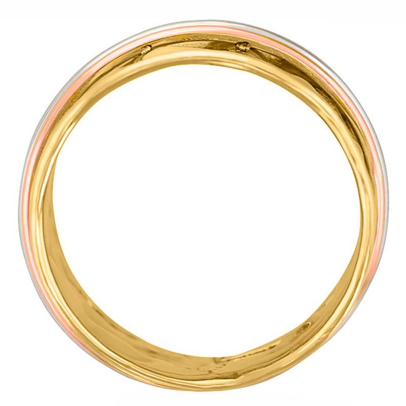 La bague est en or jaune 375/1000 (9K) et 2 fils d'or blanc et rose y sont mêlés. Notez que sa largeur est de 7mm au plus fin, et de 12mm au plus large. Son poids d'or moyen est de 2,20g.