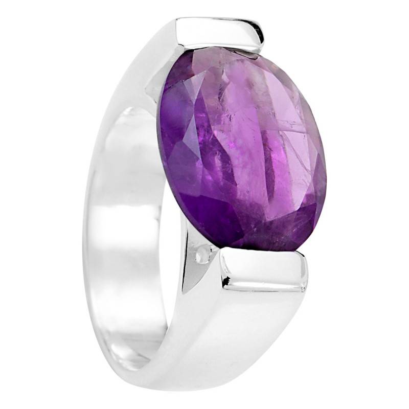 Cette bague en argent 925/1000 est ornée d'une merveilleuse pierre semi-précieuse améthyste méticuleusement travaillée. Propre à sa couleur d'origine, celle-ci, posée au centre de la monture, fera scintiller de beauté votre main et chaque vêtement auquel vous l'associerez. Toute personne qui succombera au charme de cette majestueuse bague de 9 g rayonnera d'une élégance incomparable. Pour les dimensions, elle mesure 2 mm de largeur, 6 mm de hauteur et sa pierre centrale fait 11 x 17 mm.