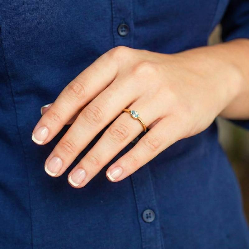 Nous vous proposons cette élégante bague en or jaune 750/1000 (18K). Moderne et colorée, elle est surmontée d'une topaze bleue sertie clos en forme de poire. Les topazes sont des gemmes naturelles, pour améliorer leur couleur, un traitement de chauffage est appliqué.