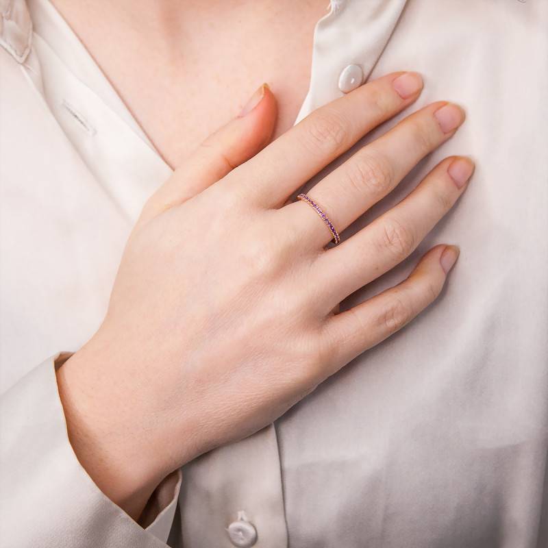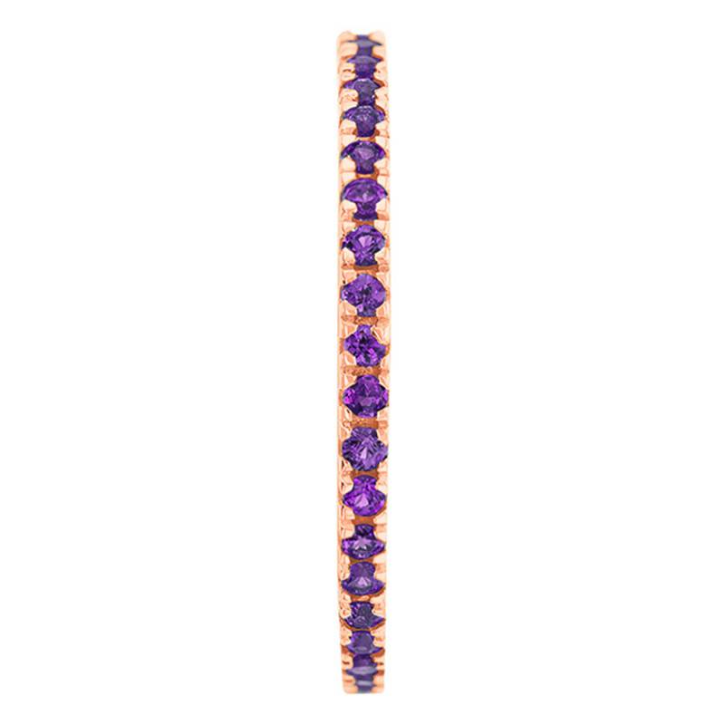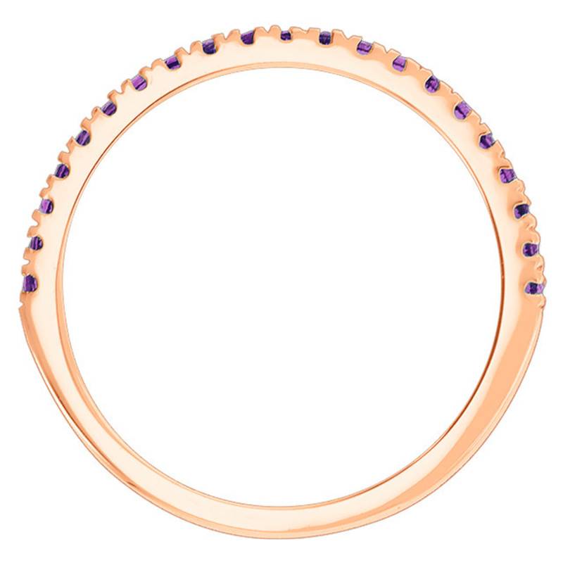 Craquez pour l'élégance et la qualité de cette douce bague spécialement conçu pour les femmes. Elle est réalisée entièrement en or rose 375/1000 (9K) et dispose des dimensions suivantes : d'une hauteur de 1,65 mm et d'une épaisseur de 1,53 mm. Concernant son poids, elle pèse 1,30 gramme. Pour apporter une touche de couleur, elle est sertie de 21 petites pierres fines, et semi-précieuses sur la moitié de la bague forgée. Ce ne sont autres que des pierres d'améthyste.