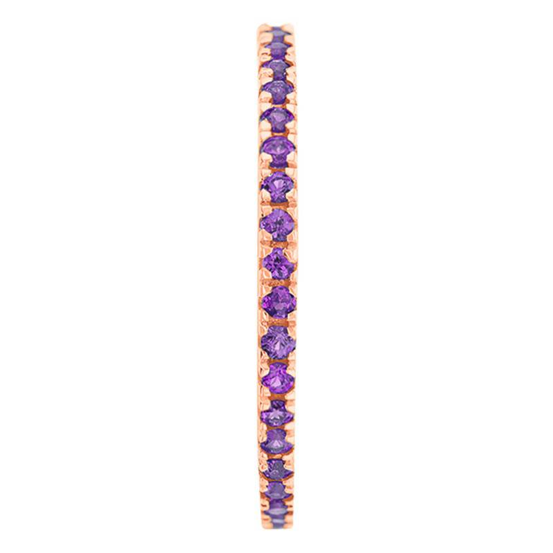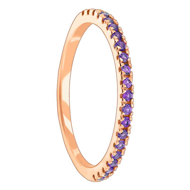 N'attendez plus pour tomber sous le charme de cette élégante bague réalisée en or rose 375/1000 (9K). Cette sublime bague d'une hauteur de 1,65 mm, et d'épaisseur 1,53 mm, pèse 1,30 gramme. Une touche de couleur est présente, puisqu'elle est sertie de 21 petites pierres fines, et semi-précieuses sur la moitié de la bague forgée en or rose 375/1000 (9K). Vous trouverez de douces pierre d'améthystes roses.