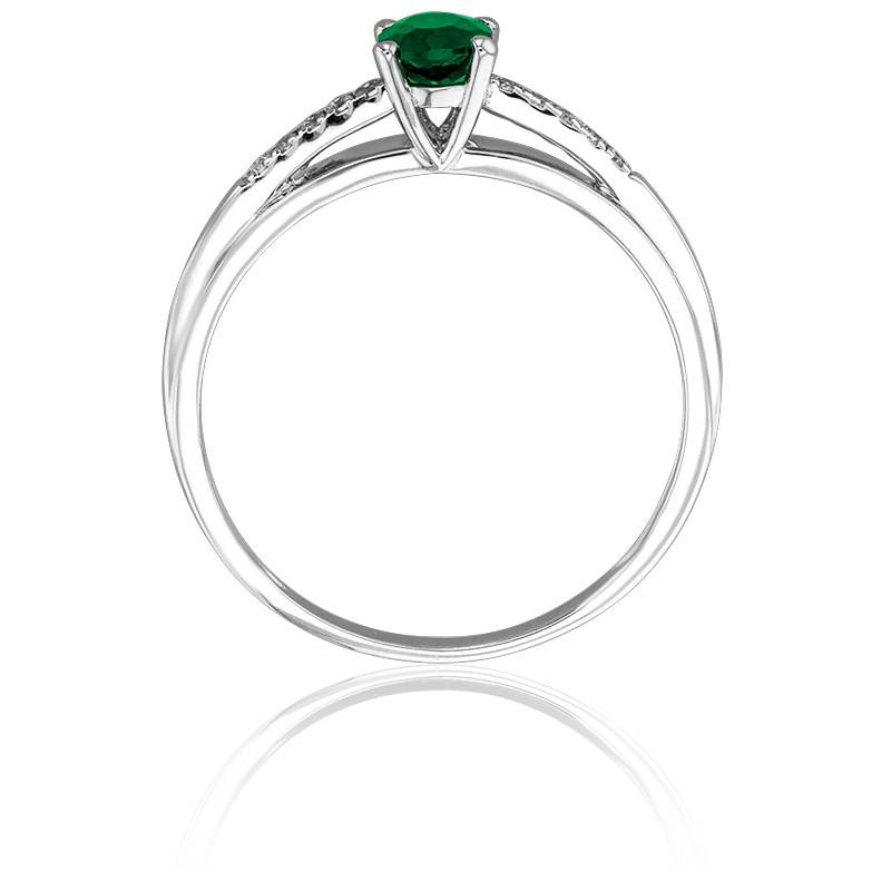 Nous vous proposons cette somptueuse bague réalisée en or blanc 750/1000 (18K) composée d'une émeraude de 0,46 carat, taillée ovale, sertie griffes à bouts ronds et d'une largeur de 6 mm. Celle-ci surplombe le fil d'or de la bague, lui-même doublé d'un fil pavé de diamants taille brillant en serti grains de part et d'autre de l'émeraude.
