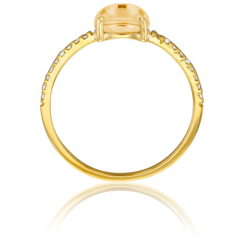 Ravissante bague en or jaune 375/1000 (9K) composée d'une citrine taillée en forme de cabochon et sertie quatre griffes mesurant 6 x 4 mm. La pierre fine est accompagnée de neuf diamants sertis à grains de chaque côté.