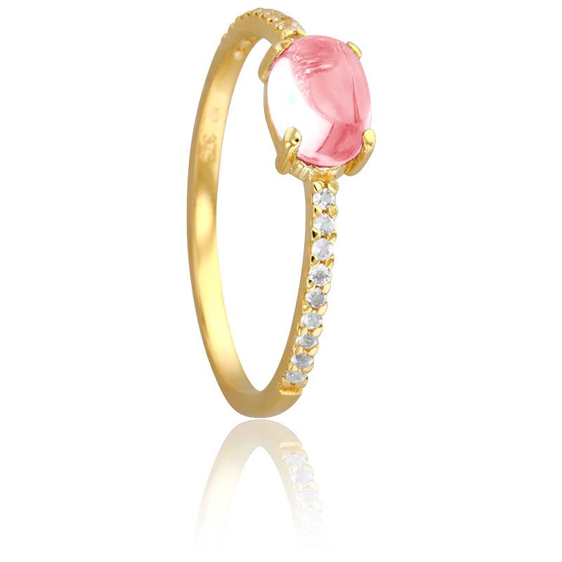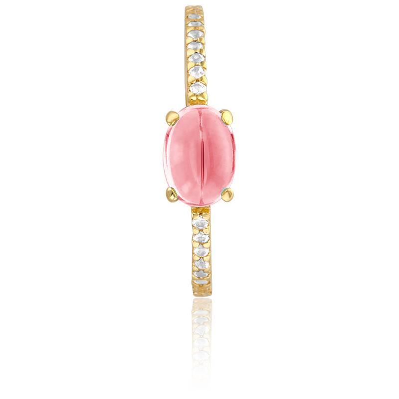 Ici, c'est une ravissante bague en or jaune 375/1000 (9K) composée d'une tourmaline taillée en forme de cabochon et sertie quatre griffes mesurant 6 x 4 mm. La pierre fine est accompagnée de neuf diamants sertis à grains de chaque côté.