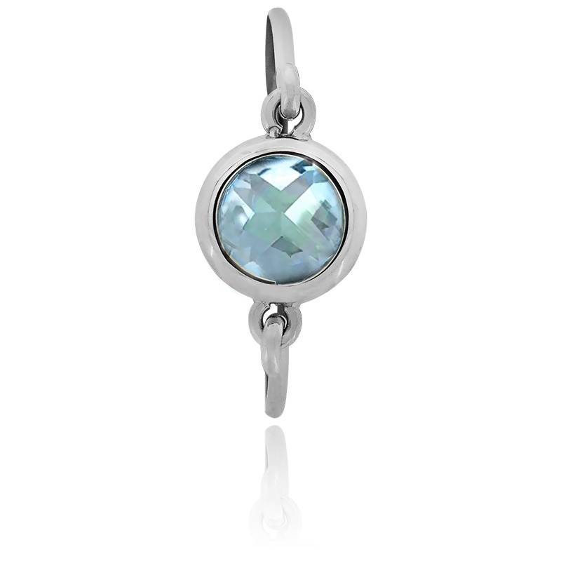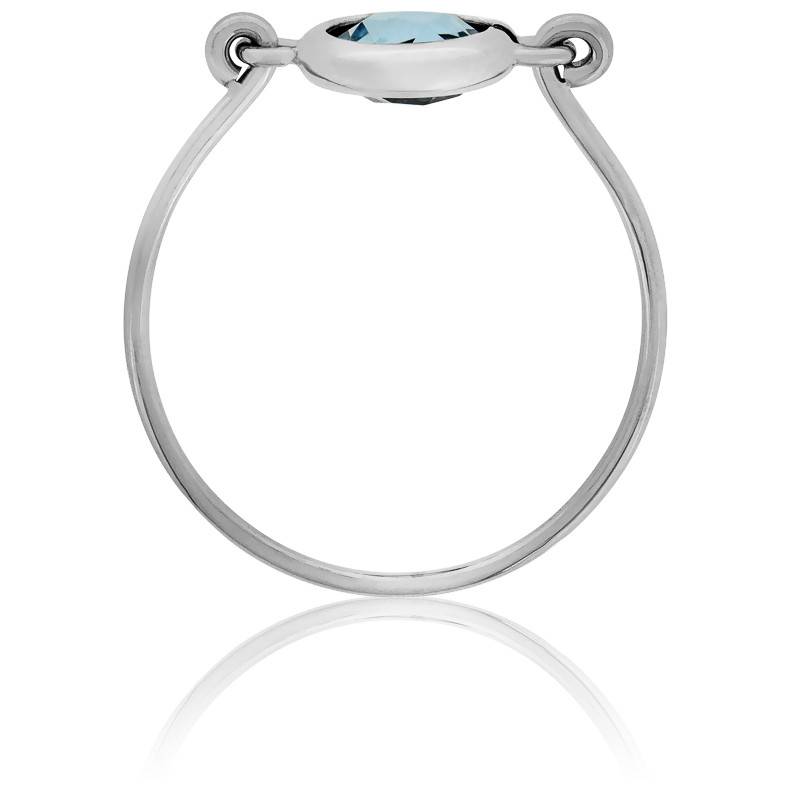 Succombez à la bague Kirkos de la marque Les Valentines. Cette bague en or blanc 750/1000 (18K), a un design original et tout en finesse. Une topaze bleue ronde de 6 mm de diamètre est mise en avant dans un serti clos. Celui-ci est maintenu au corps de bague à l'aide de deux petites bélières de part et d'autre de la pierre.
