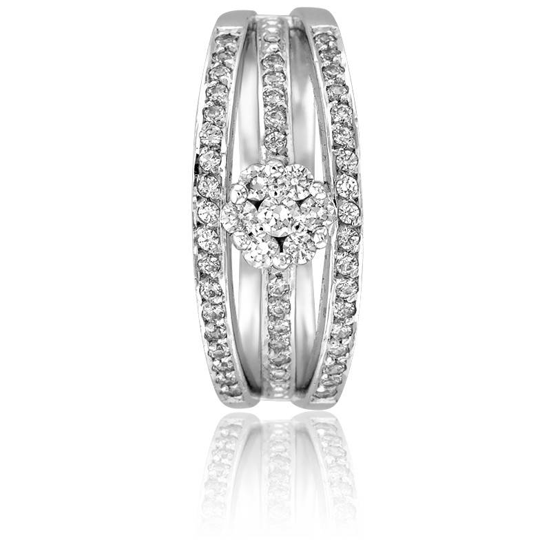 L'anneau ajouré se transforme en trois branches pavées de diamants sertis à grains accompagnées en son centre d'un cercle pavé de diamants représentant une fleur. Ces diamants taillés en brillant ont un poids total de 0,70 carat et sont de couleur H et de pureté SI1. Le poids d'or de ce bijou est de 5,56 grammes pour 4 mm de largeur.