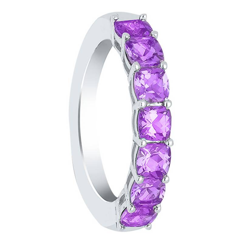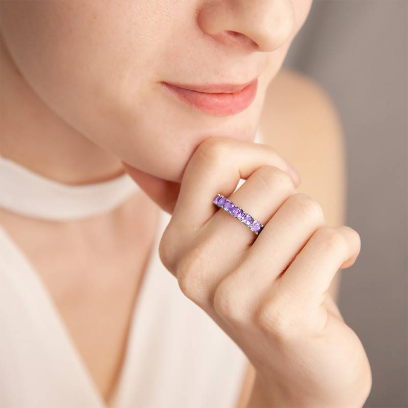 Et pourquoi pas du violet ? Couleur tendance et hypnotisante, elle est parfaite pour apporter une touche de modernité à vos tenues. Aurora vous propose donc cette magnifique bague en or blanc 750/1000 (18K) entièrement sertie de pierres d'améthyste. Cette pierre fine connue dans le monde entier habillera votre doigt avec élégance. C'est au nombre de 7 et avec un poids total de 2.3 carats, que l'on retrouve ces sublimes pierres. Elles sont serties à griffes sur un corps de bague de largeur 4 mm pour une épaisseur de 3.5 mm. Le poids d'or moyen du bijou est quant à lui est de 3 grammes.