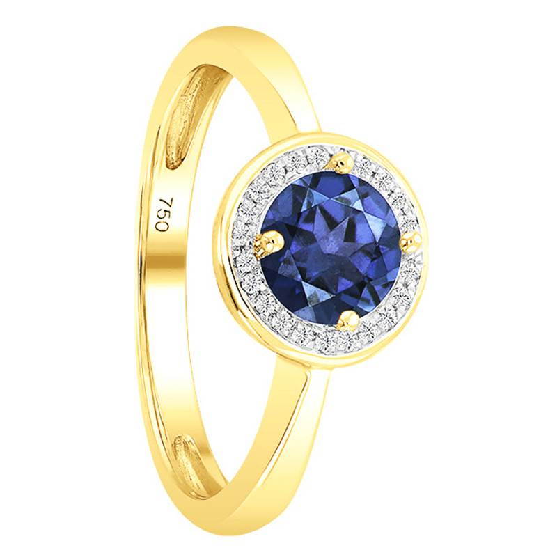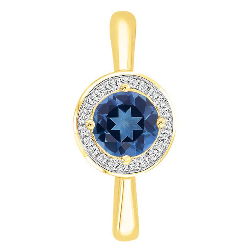La maison est heureuse de vous dévoiler cette charmante création qui va vous faire fondre à coup sûr ! Cette bague en or jaune 750/1000 (18K) est ornée en son centre d'une magnifique pierre de topaze blue london. La topaze blue london a la particularité d'être de couleur bleue/grise. Elle dispose d'une forme ronde et a un poids de 0,588 carat. Elle est sertie à griffes et a comme diamètre 5 mm. Pour la sublimer, elle est entourée de plusieurs diamants sertis à grains pour un poids total de 0,05 carat.