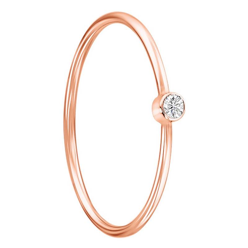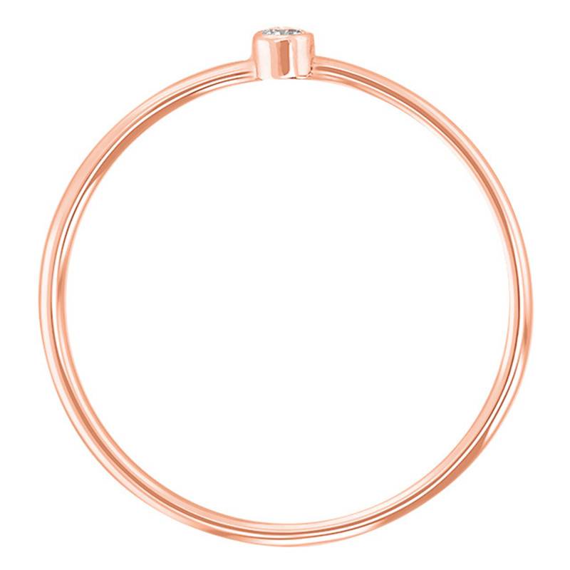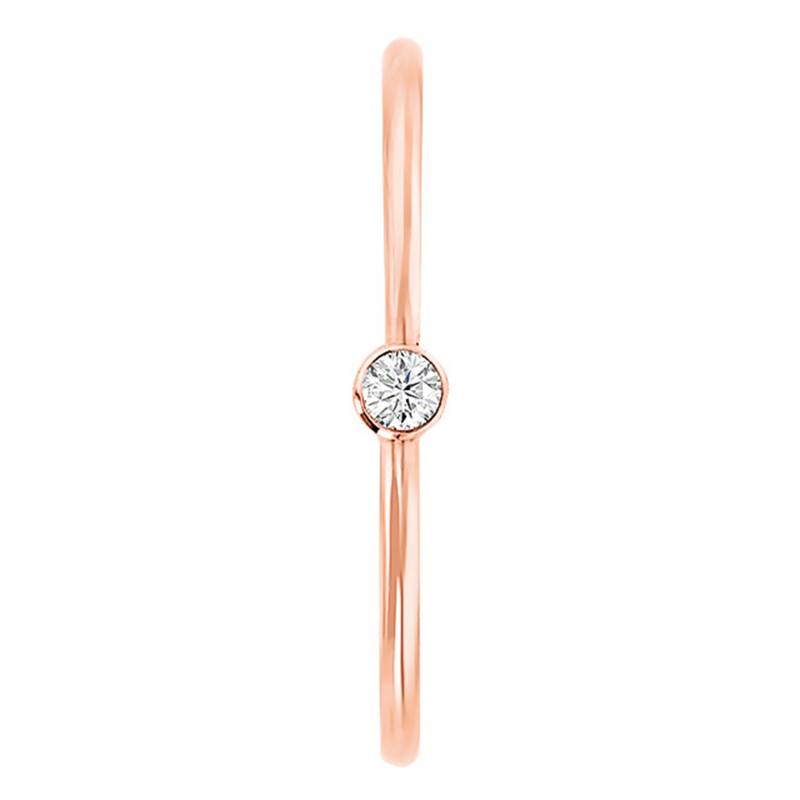 Ocarat vous dévoile cette mignonne bague diamant or rose 750/1000 (18K). Raffinée et élégante, elle est constituée d'un corps de bague type jonc surmontée d'un diamant de 0,02 carat de couleur G et de pureté VS1 en serti clos. L'anneau ainsi que la tête de bague ont une largeur de 1,00 mm et le poids d'or moyen est quant à lui de 0,80 gramme.