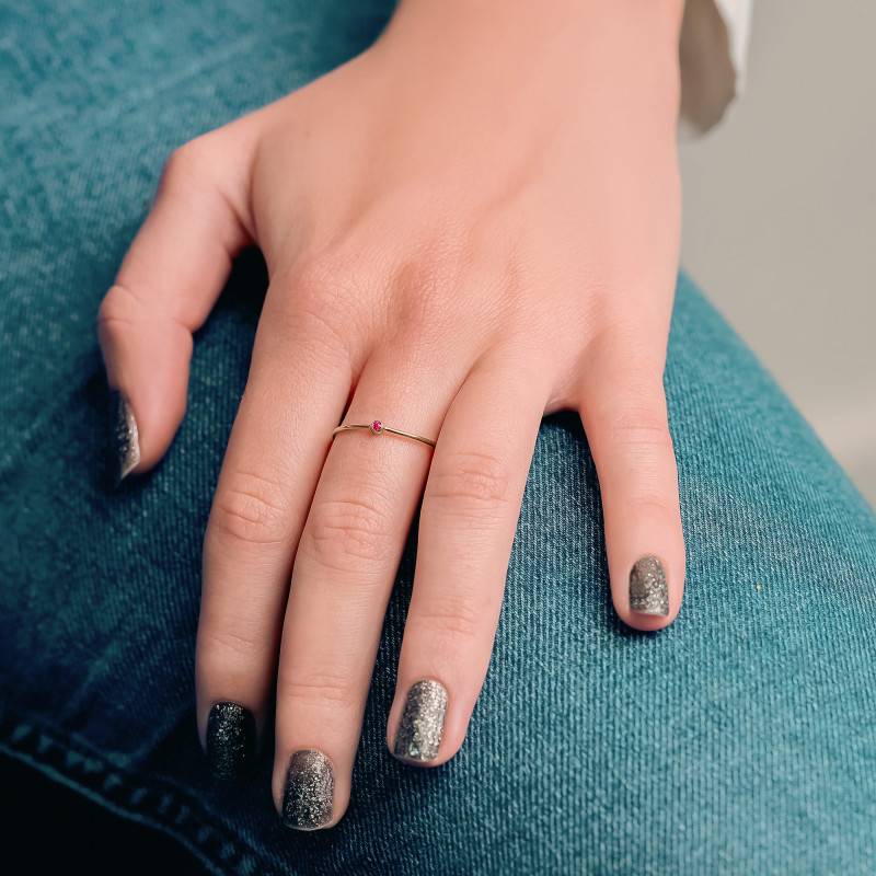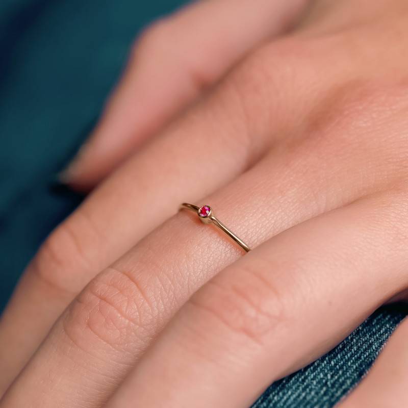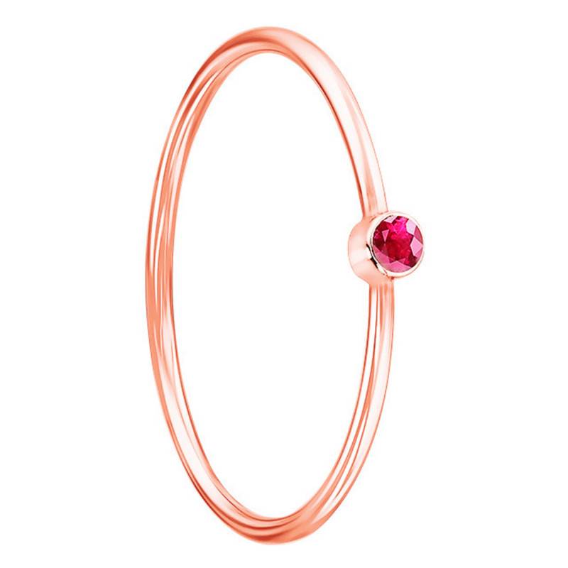 Cette ravissante bague est composée intégralement en or rose 750/1000 (18K). Est serti clos sur le corps type jonc du bijou un magnifique rubis de 0,02 carat et de 1,80 mm. La couleur vive de la pierre, un rouge vibrant, se marie à la perfection avec le rosé du métal. L'ensemble donne un côté romantique et semble faire une éloge à l'amour ! Ce modèle a un poids moyen de 0,80 gramme, ce qui en fait une bague légère et fine, parfaite pour toutes les femmes à la recherche d'un bijou signature.
