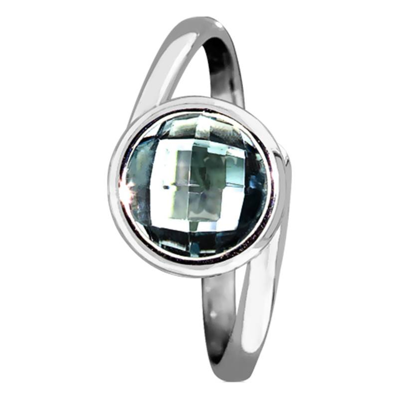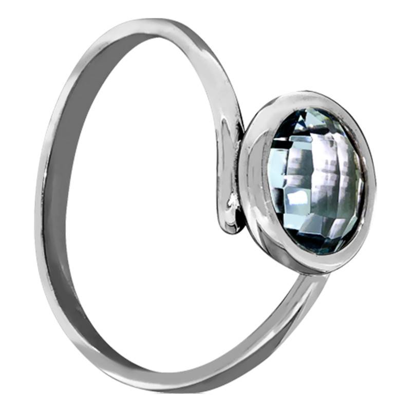 Nous vous proposons cette délicate bague en or blanc 750/1000 (18K) rhodié possédant en son centre une topaze bleue. Cette pierre est de forme ronde et de 8 mm de diamètre, soit 2 carats environ. Le corps de la bague s'ouvre en 2 et supporte la topaze sertie clos.