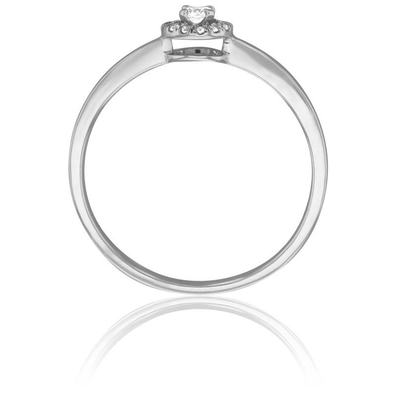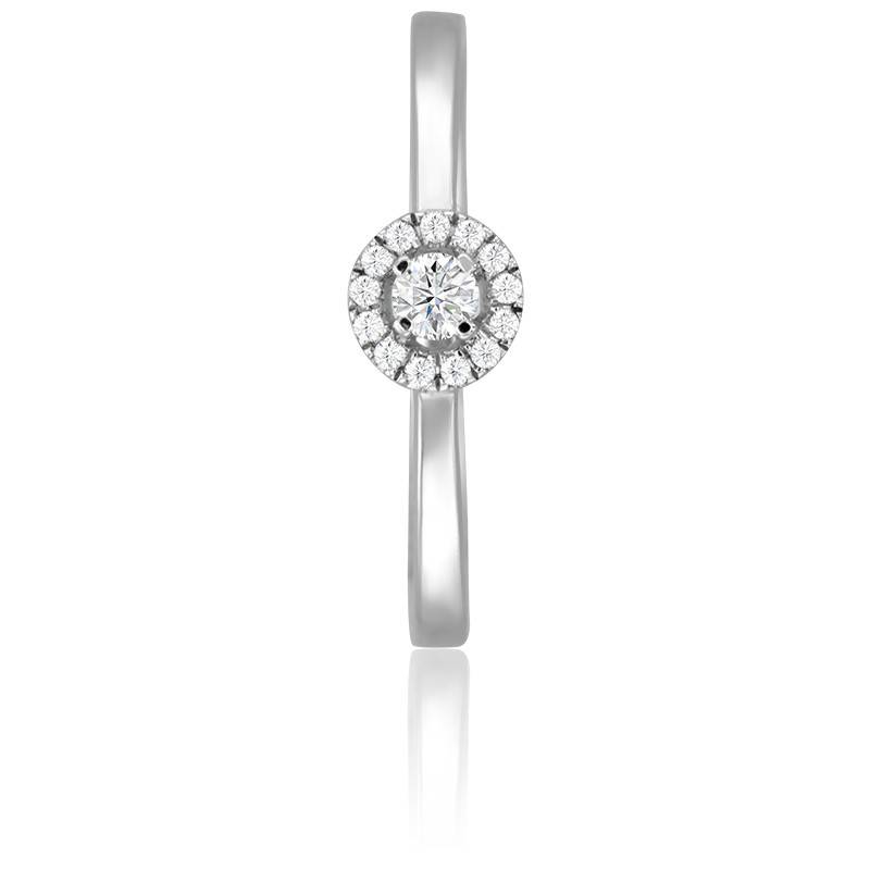 Bague solitaire discrète et élégante en or blanc 750/1000 (18K) avec une tête de bague de forme ronde et un solitaire serti quatre griffes de 0,07 carat accompagné d'un pavage de diamants sur la tête de bague