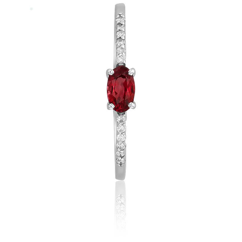 Craquez pour le charme de cette ravissante bague en or blanc 750/1000 (18K). Cette bague est ornée d'un rubis rouge de forme ovale et d'une longueur de 5 mm pour une hauteur de 3 mm. Cette pierre est sertie quatre griffes et est ornée par douze diamants sertis à grains. Le poids total en carat de la pierre centrale est de 0,25 carat. De chaque côté du rubis, six diamants sertissent l'anneau. Les diamants ont un poids de 0,06 carat soit 0,005 ct chacun. Leur qualité est HSI. Enfin, l'anneau a une largeur de l'anneau est de 1,50 mm.