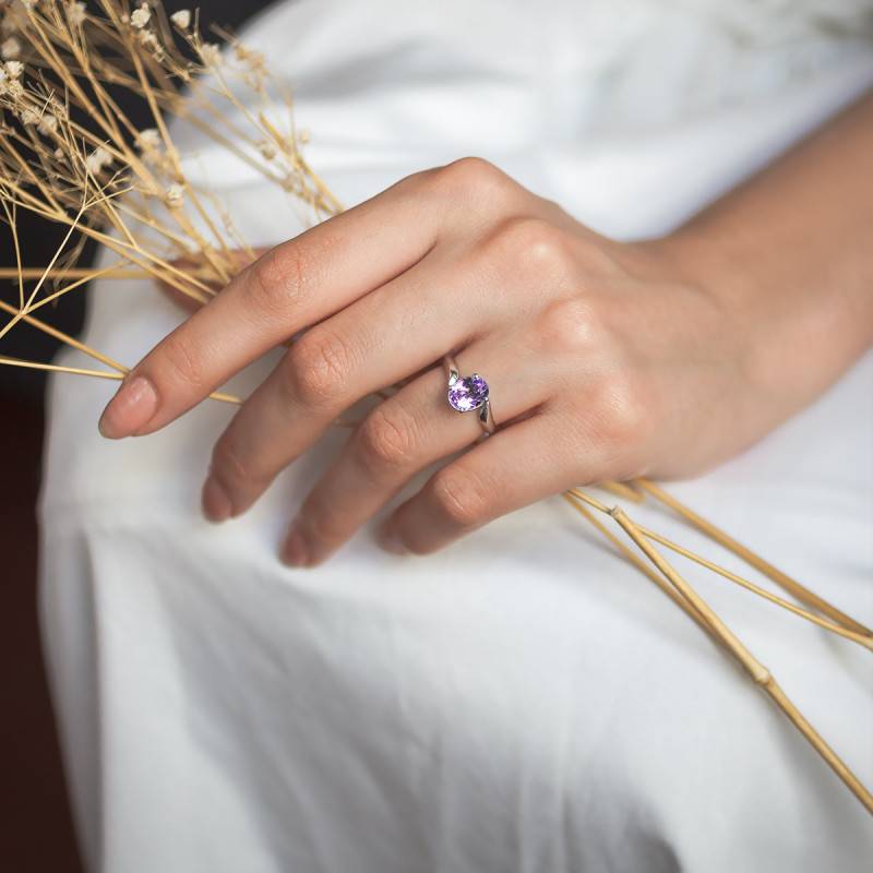 Nous vous proposons cette somptueuse bague en or blanc 375/1000 (9K). De forme demi-bombée, on peut retrouver en son centre serti, une magnifique pierre d'améthyste. Cette améthyste est de forme ovale, sertie à griffes, et a comme dimension 7 x 9 mm soit un poids de 2,20 carats. Son violet éclatant apportera une touche de couleur à vos doigts ! Cette bague en or blanc est disponible de la taille 48 à la taille 60. Quant à son poids, il est de 1,40 gramme.