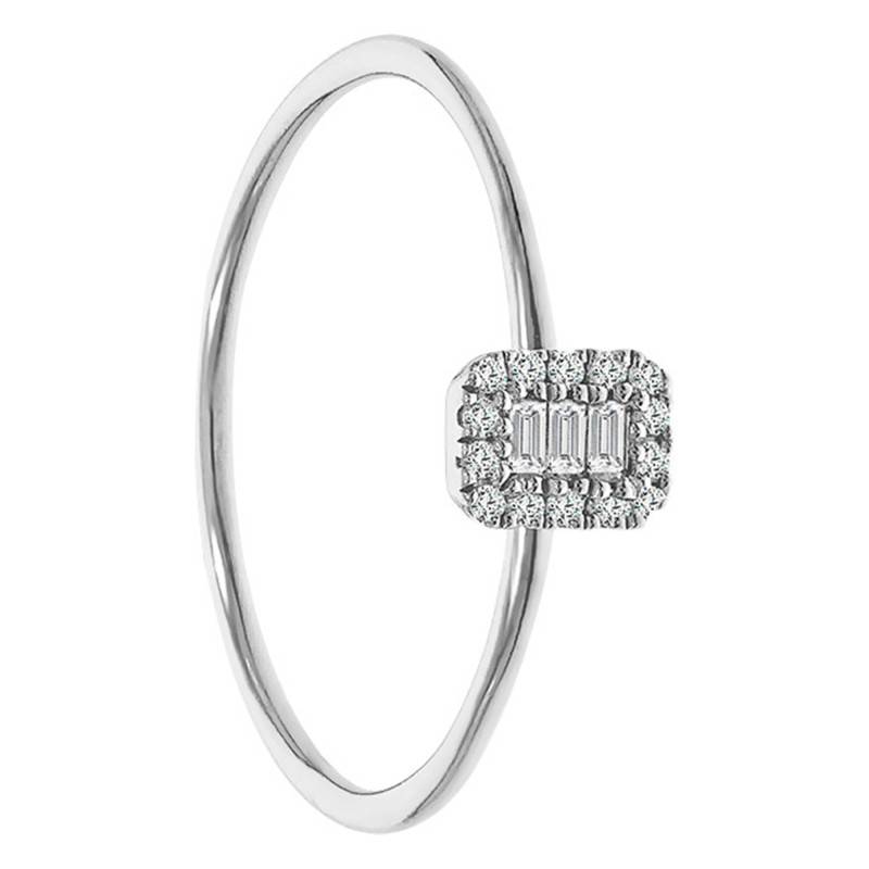 Ocarat vous présente aujourd'hui sa sublime bague de fiançailles fabriquée en or blanc 375/1000 (9K) au poids moyen d'or de 1,04g. Cette bague et son alliage fin sont un modèle classique et raffiné. Sur le dessus de celle-ci se trouvent 17 diamants d'un caratage total de 0,1 ct, dont 3 de 0,05 ct de taille baguette, 10 autres de 0,04 ct et 4 de 0,01 ct de taille ronde.