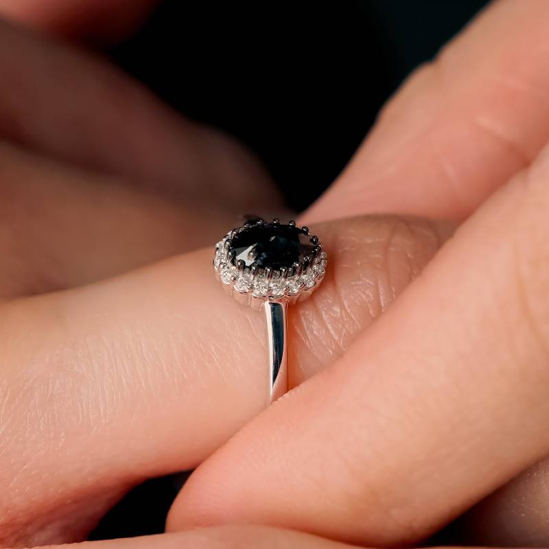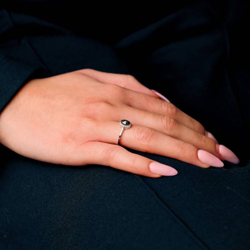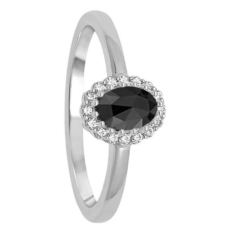 Laissez-vous tenter par cette jolie bague en or blanc. Elle se compose d'un anneau très fin de 1,50 mm. Sur la partie supérieure se trouve un diamant noir ovale. Le diamant noir est serti à grains et présente un poids de 0,60 carat. Tout autour, vous trouverez 10 diamants blancs pour un poids total de 0,08 carat. Comptez une largeur de 8,30 mm pour une épaisseur de 3,20 mm au niveau de la partie supérieure.
