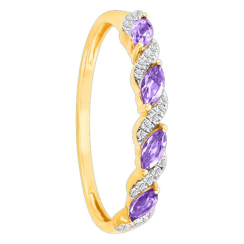 Offrez le plus beau des cadeaux avec cette bague en or jaune 375/1000 (9K). Son design épuré et son style sophistiqué en ravira plus d'une ! Elle se compose d'une alternance d'améthyste et de diamants pour un rendu coloré et brillant. Inspirée de la haute joaillerie, elle sublimera toutes tenues. Les améthystes sont au nombre de quatre pour un poids total de 0.27 carat tandis que les diamants sont au nombre de 25 pour un total de 0.06 carat. De couleur GH et de pureté I1, ils apportent une touche de préciosité au bijou.