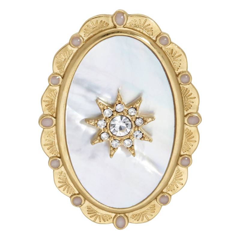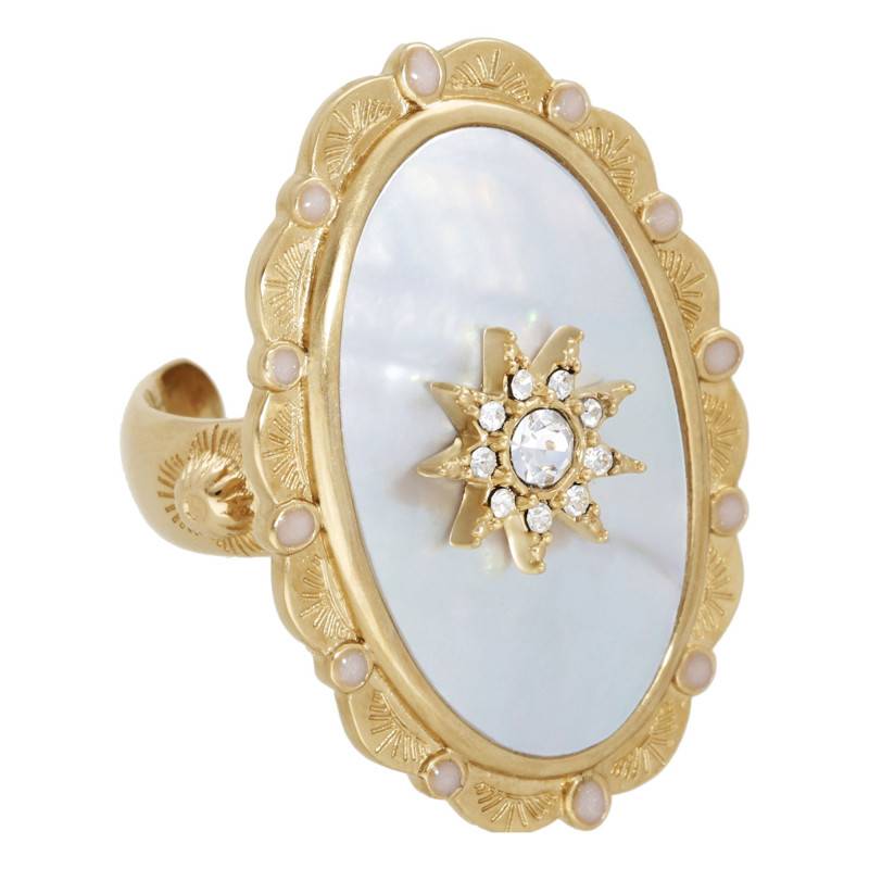 Cette jolie bague ouverte de la collection Nuria est un ravissant bijou qui rappelle les parures du moyen-age. Il se compose d'un plateau ovale conçu en laiton doréet sa monture présente des motifs gravés. Elle est d'autant plus mise en valeur par de jolies pierres en émail. Le centre est constitué d'une surface en pierre d'imitation nacre blanche qui se pare d'une belle étoile sertie de pierres blanches. L'ensemble affiche un beau rendu esthétique qui ne passera pas inaperçu.