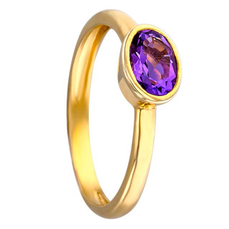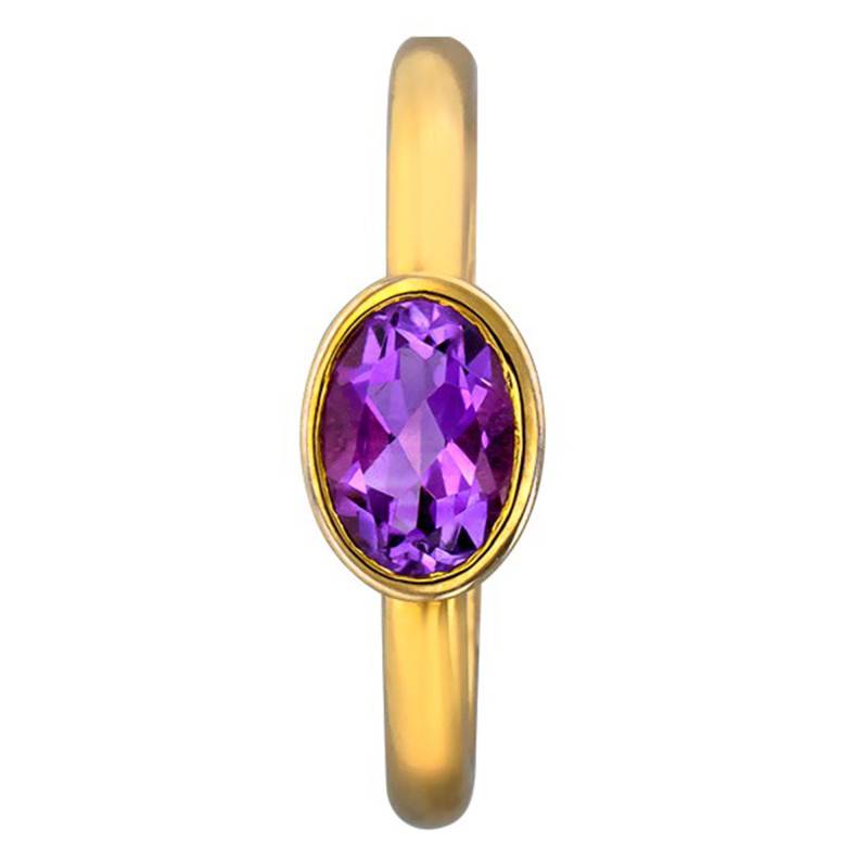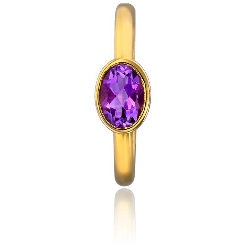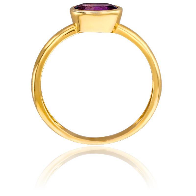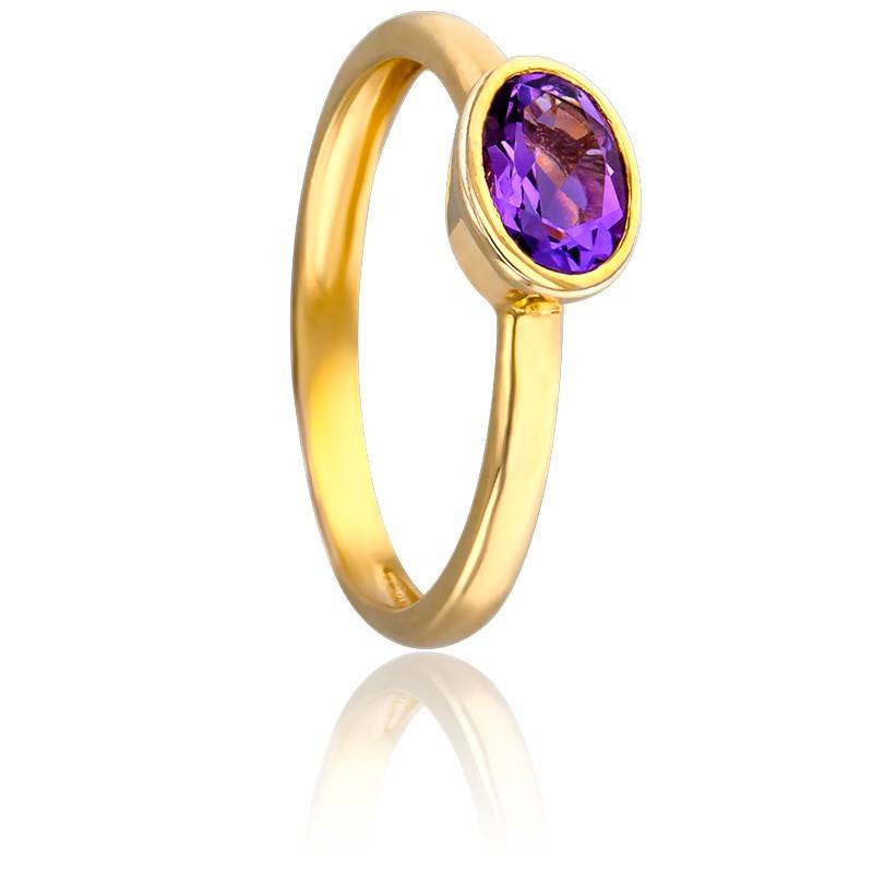 Nous vous avons sélectionné de magnifiques bagues en or et pierre d'améthyste. Retrouvez donc cette élégante bague en or jaune 375/1000 (9K) surmontée d'une sublime améthyste violette. Elle est sertie clos et taillée ovale. La pierre a une largeur de 8 mm, une hauteur de 6 mm, pour une épaisseur de 4 mm. Le fil fait 2 mm d'épaisseur pour un poids d'or moyen de 1,37 gramme.