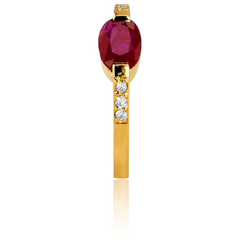 Parmi les nouvelles collections, une pièce se démarque : cette ravissante bague rubis en or jaune 750/1000 (18K) ornée de six diamants, pour un poids total de 0,06 carat. C'est la tête de bague aux dimensions 16 x 4,90 mm qui dévoile en son centre l'imposant rubis 5 x 7 mm taille cabochon serti deux griffes et de 0,95 carat.