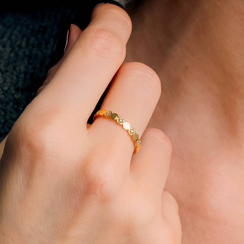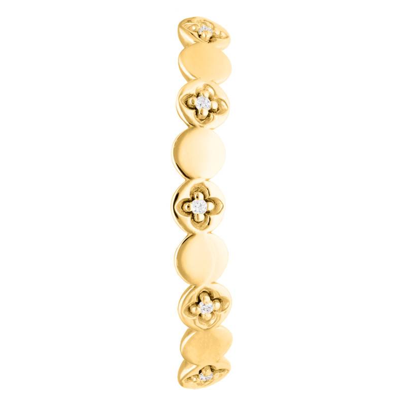 Éclatante dans sa couleur jaune, la Bague Perlée & Trèfles Alternés en Diamants 0,01ct en Or Jaune 375 inspire la sophistication en toute simplicité. Forgée en or jaune 375/1000 (9K), elle se pare d'une finition polie et brillante qui sublime sa beauté naturelle. Avec une délicate épaisseur de 0,80 mm et un poids de 1,03 g, cette bague est ornée de cinq diamants blancs d'un éclat pur, totalisant 0,01ct.