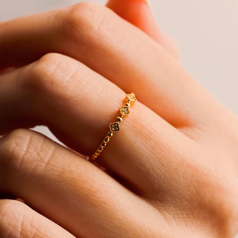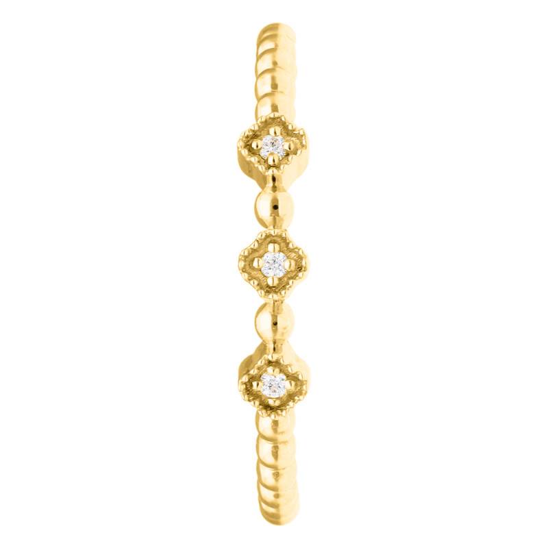 La Bague Perlée & Trilogie de Diamants 0,02ct en Or jaune 375 est un symbole de finesse et d'émotion. Conçue en Or jaune 375/1000 (9K) et dotée d'une finition polie et brillante, elle se distingue par son éclat maîtrisé. Trois diamants blancs, totalisant 0,02 ct, sont sertis avec précision, représentent trois petits trèfles. Fine et légère, avec une épaisseur de 1,20 mm et un poids de 1,04 g, elle épouse le doigt avec un confort naturel.