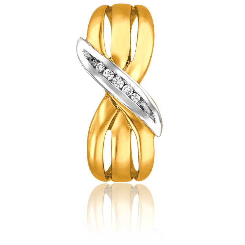Découvrez cette élégante bague deux ors 750/1000 (18K) dont l'anneau se découpe en plusieurs branches en or jaune qui s'entremêlent. Une plus petite branche en or blanc emprisonne en son cœur cinq diamants sertis rails.