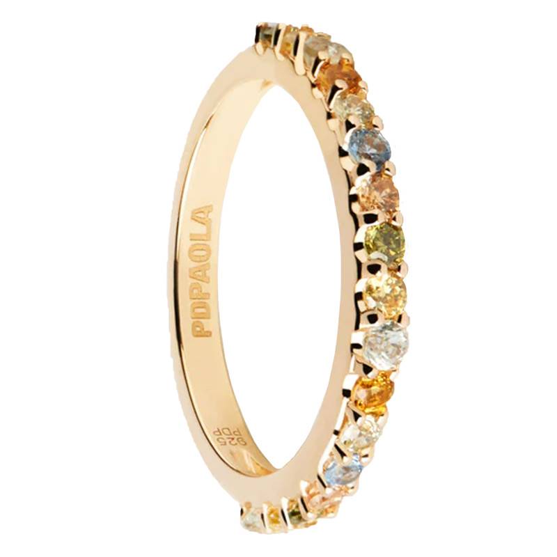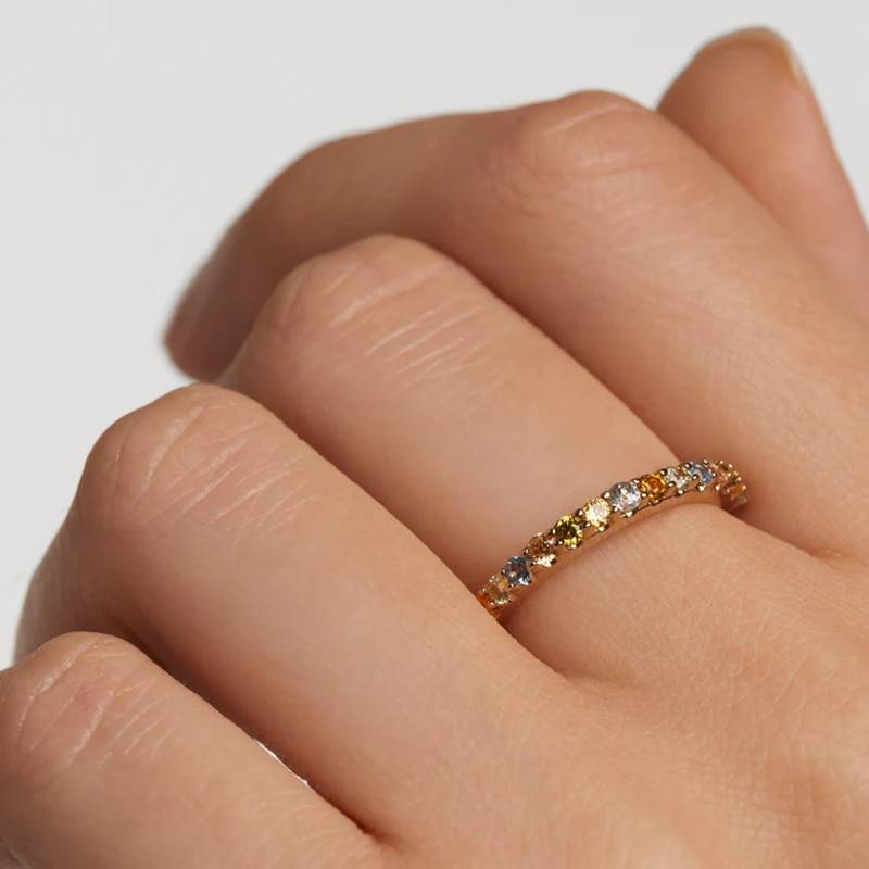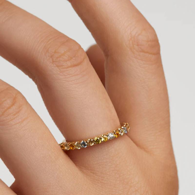 Craquez pour cette belle bague Rainbow. Elle est fabriquée en argent 925 recyclé et est plaquée en or jaune 750, assurant une grande durabilité. Son anneau semi-éternité de 2,20 mm d'épaisseur glissera délicatement sur votre doigt et est rehaussé par une finition polie pour un rendu brillant. Son éclat est attisé par un pavé de 17 zircones de couleurs menthe, jaune clair, vert olive, pêche, bleu ciel, vert citron et orange créant un joli contraste. Taillées rondes et serties à griffes, ces pierres affichent des reflets de lumière étincelants et accordent une touche de fantaisie à ce bijou. Cette bague est facile à assortir et peut être portée seule comme combinée à d'autres bagues pour un effet plus prononcé. Quant à son poids, il est de 2,18 grammes et assure confort et légèreté.