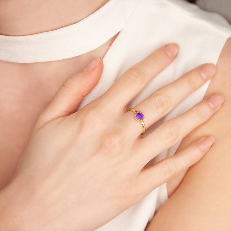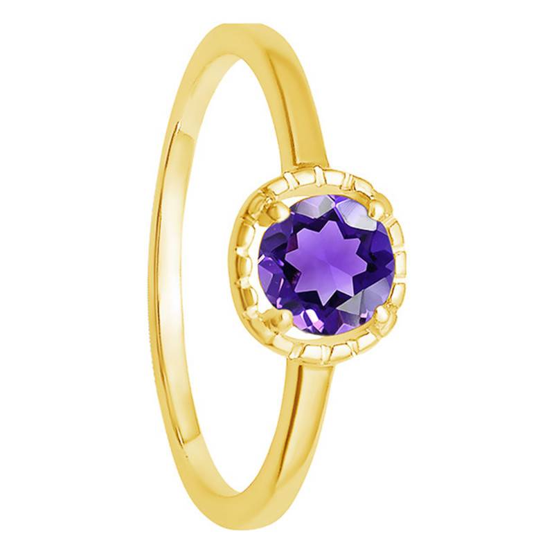 Laissez-vous tenter par la finesse et l'élégance de cette bague en or jaune 375/1000 (9K). Celle-ci est de haute qualité pour vous suivre de nombreuses années. Une somptueuse pierre d'améthyste habille ce bijou d'exception. D'un poids de 0.26 carat et de forme ronde, elle s'impose avec délicatesse et modernité sur le corps de bague. Afin de la mettre en valeur, l'améthyste est accompagnée de détails perlés qui ajoutent une touche d'originalité au bijou.
