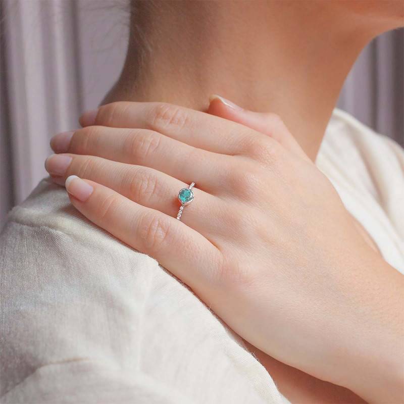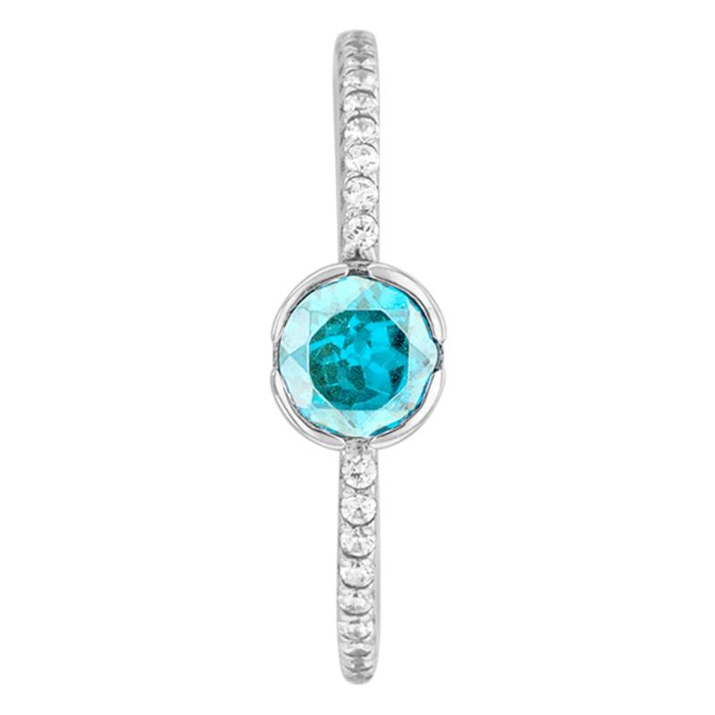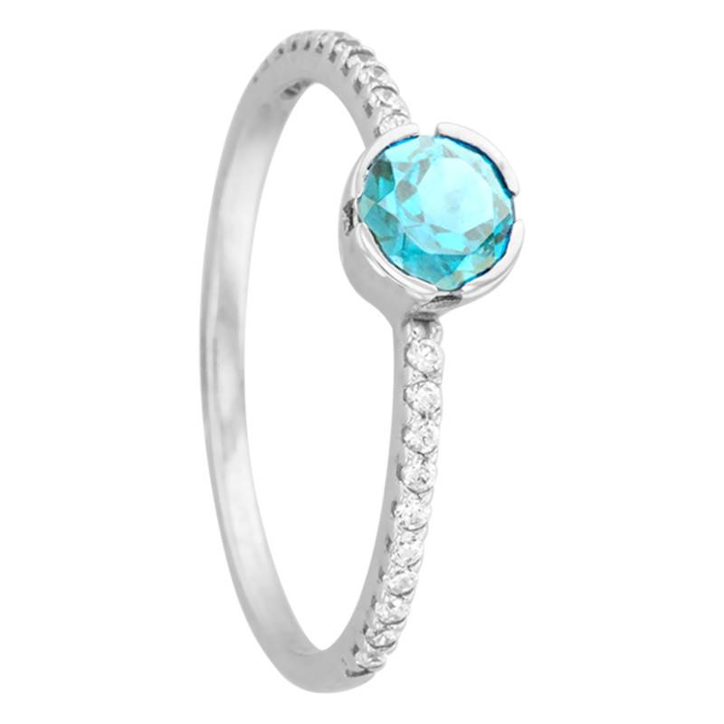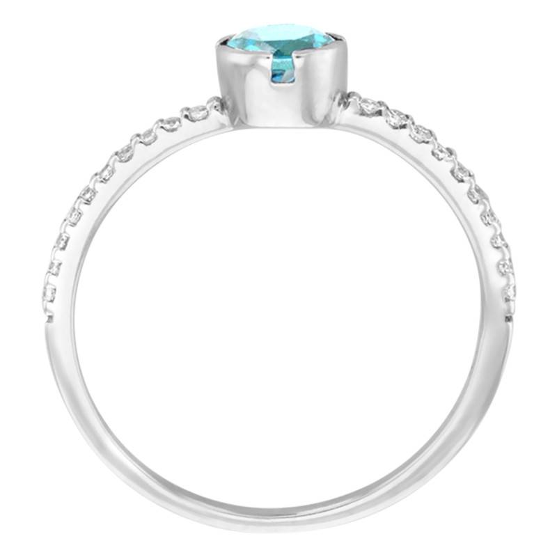 Faites plaisir en offrant cette ravissante bague en or blanc rhodié 750/1000 (18K). Elle se compose d'une aigue-marine taillée en brillant et sertie semi-clos d'un diamètre de 5 mm. La pierre fine est accompagnée de dix diamants sertis à grains de chaque côté.