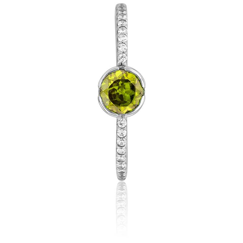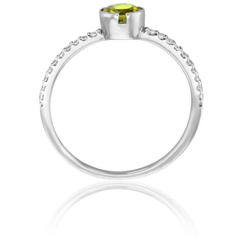 A la recherche d'un bijou tendance et moderne ? Craquez pour cette ravissante bague en or blanc rhodié 375/1000 (9K). Elle se compose d'un sublime péridot taillé en brillant et serti semi-clos d'un diamètre de 5 mm. La pierre fine est accompagnée de dix diamants sertis à grains de chaque côté.