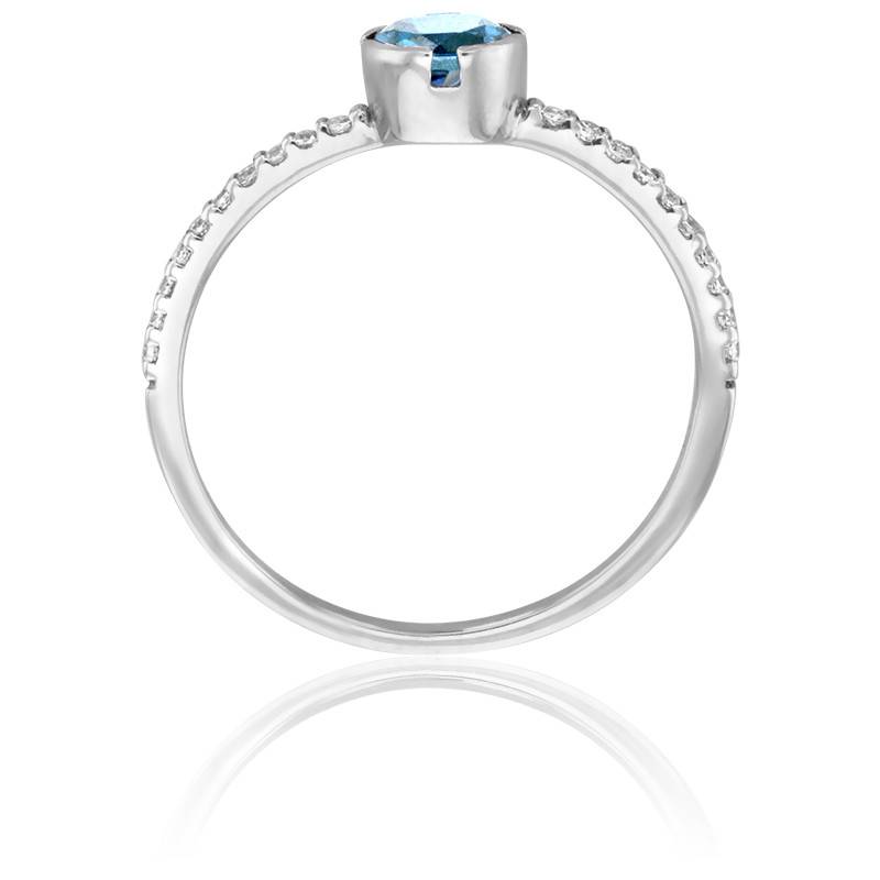 Craquez pour cette ravissante et somptueuse bague en or blanc rhodié 750/1000 (18K) sertir d'une topaze bleue. La pierre taillée en brillant est sertie semi-clos et possède un diamètre de 5 mm. La pierre fine est accompagnée de dix diamants sertis à grains de chaque côté.