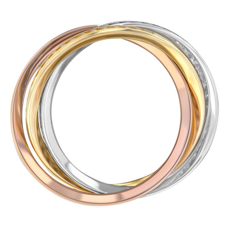 Découvrez ici cette sublime bague composée de trois anneaux entrelacés confectionnée en or jaune, blanc et rose. Chacun des anneaux de 1.53 mm d'épaisseur est serti de magnifiques oxydes de zirconium d'un diamètre de 1 mm. Ce bijou est tendance, charmant, léger et facile à porter.